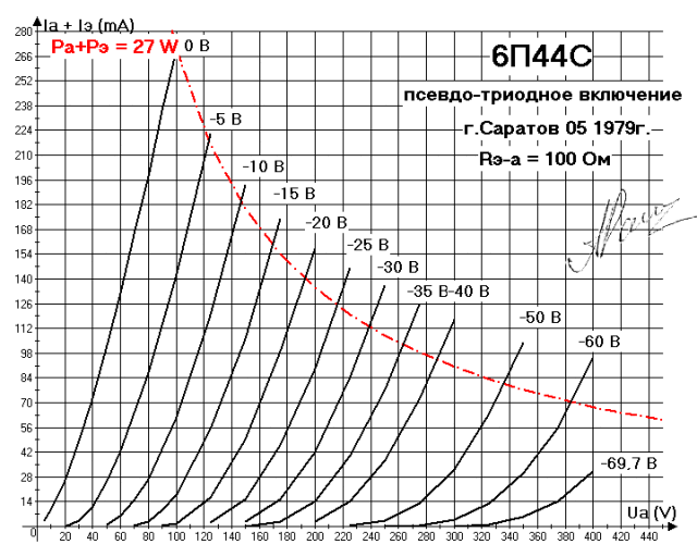 Вот реальные значения которые мы получим при рабочей точке лампы 6П44С U=180 В и питании усилителя не менее 250 В (не нужно забывать про 20 В) которые падают на катодном резисторе.
