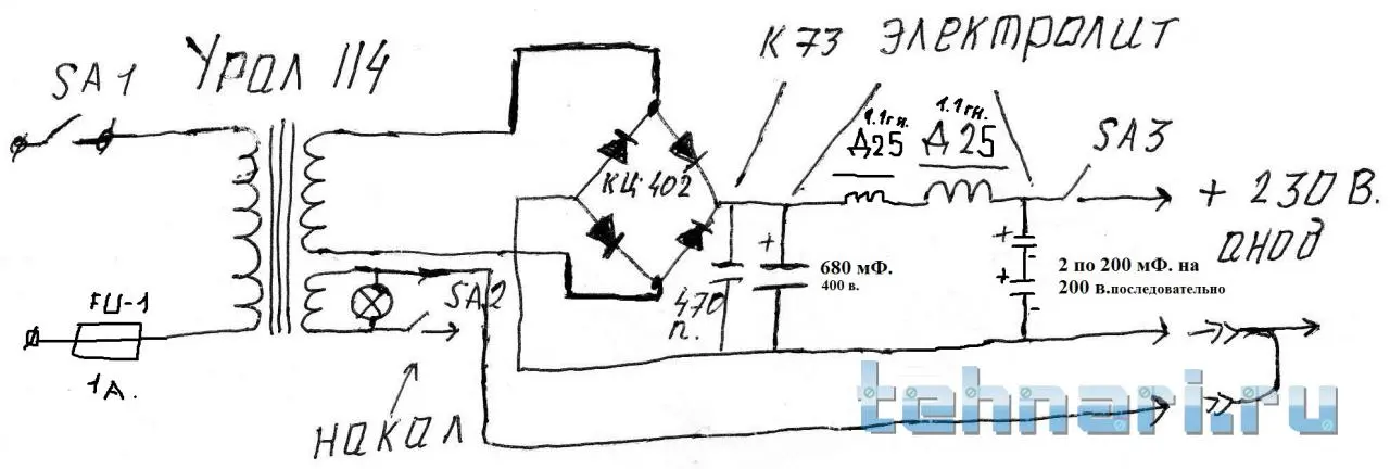 Где то я читал про борьбу с фоном от накальной обмотки там советовали если уж нечё не помогло то можно один конец накальной обмотки посадить на минус (корпус шаси) т.е. подать отрицательный потенциал на накал чтоб нить накала получилась от части катодом и фон исчезает.А выключатель так на всякий случай для тестово ремонтных работ , хотя Ластик опять напишет что его нельзя ставить и приведёт график и формулу какую то.tehno012