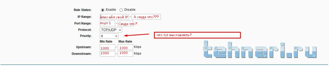 в ай-пи рандж, думаю вписать диапазон ай-пи соседей(свой комп втыкать в первый разъем и под первым ай-пи, что главное), а в ап-стрим - довн-стрим скорость отдачи и загрузки соответственно. В Кб/с.