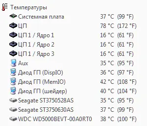 P.S. Прилагаю скрин с температурками, с учетом нынешней жары :) На температуру ЦП не смотрите, она и не изменяется, так с покупки было. Датчик наверно фуфлит или еще чего :D