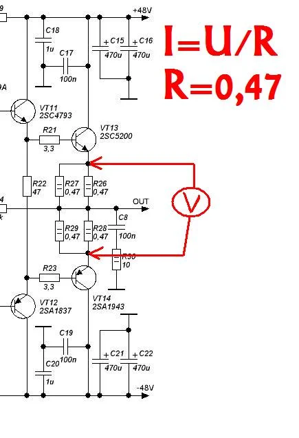 К эмиттерным резисторам цепляется милливольтметр. Ток находится по закону Ома.
