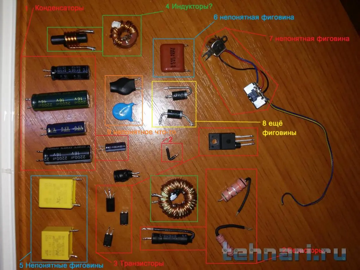 Добрый день, помогите опознать компоненты. Нашел на чердаке коробку с кучей элементов, а для чего нужны и вообще что из них что не знаю. Есть желание заняться электроникой, подскажите где нарыть литературу для новичков или хотя бы способы опознания компонентов.(тем более, что здесь ещё две коробки проводов, моторчиков, лампочек, светодиодов и проч.)