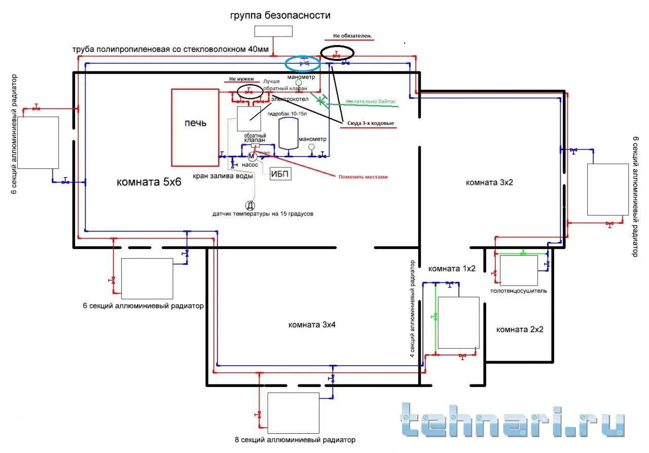 Два крана ставлю в случаи замены батареи. А вот про байпас не понялЖелательно (для правильности регулирования, удобства и т.п.) поставить перед тройником кран и на большой контур. Также желательно в этом месте байпас с краном. И достаточно (для регулирования в контурах нужной температуры) кранов только на "обратках". Раньше давление уравнивали пережимом труб, сейчас шаровой купить не проблема.