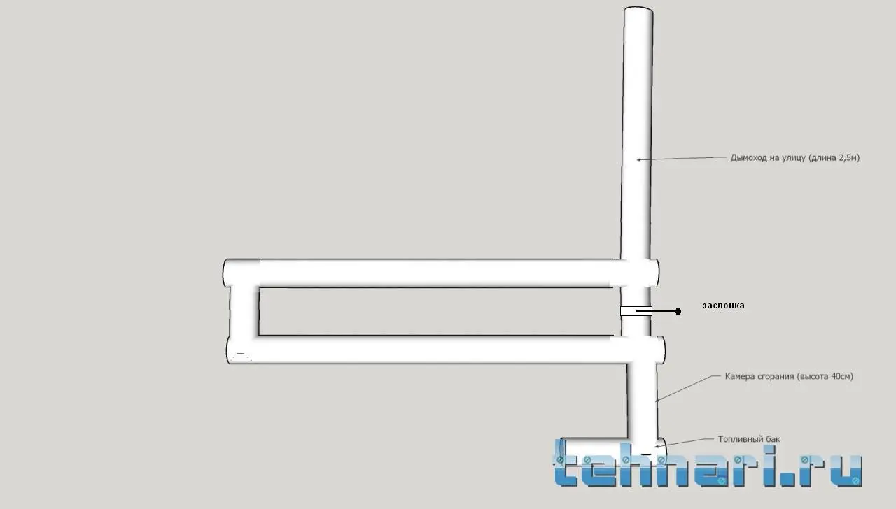 И тут я подумал об такой давно (и наверное многими) изученный и реализованный вариант отопления - печка на отработке, изначально думал взять классический вариант, две "кастрюли" соединенных между собой камерой сгорания, и дальше дымоход уходит на крышу. Но меня этот вариант не совсем устроил, во-первых, низкий КПД конструкции, т.к. по сути теплообменником является только сама печка, и часть дымохода, а остальное тепло летит в трубу.