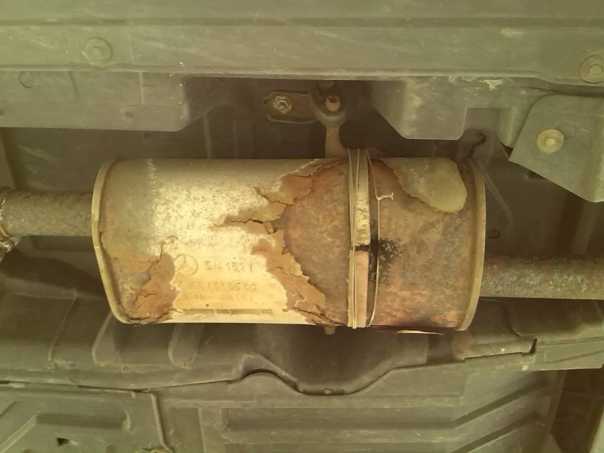Глушитель моей машины.. 9 лет и 140 000 км. Услышал неправильный звук, поддомкратил.. висит на честном слове, для "доехать до дома" пришлось подвязать проволокой. Посмотрим сколько отработает новый, надеюсь дожить. :)