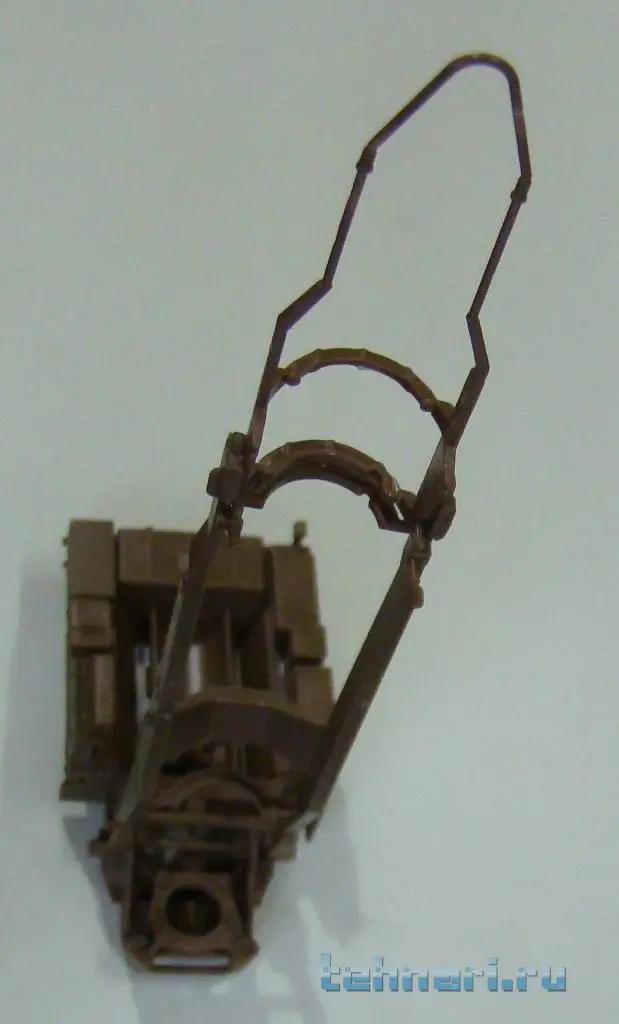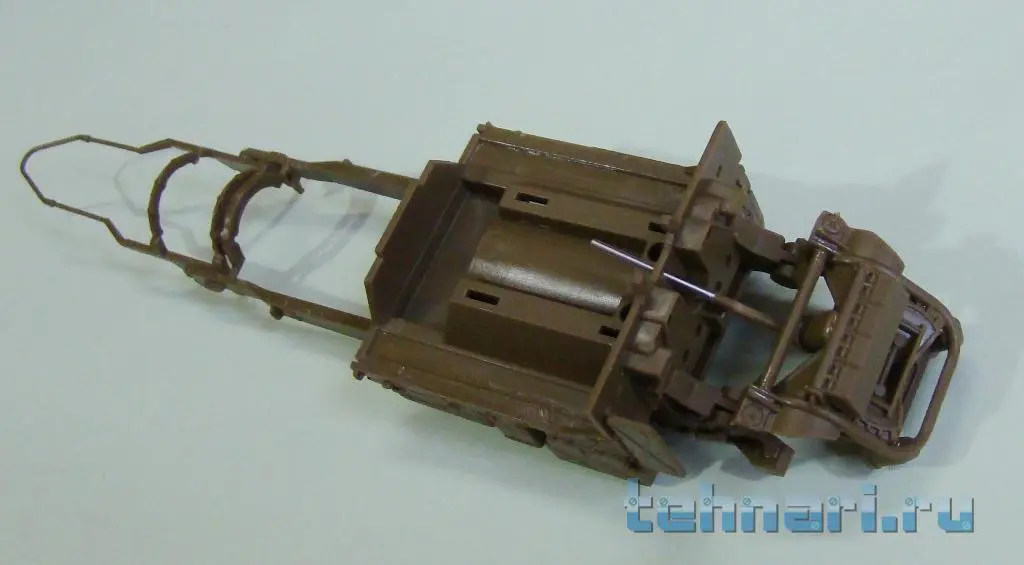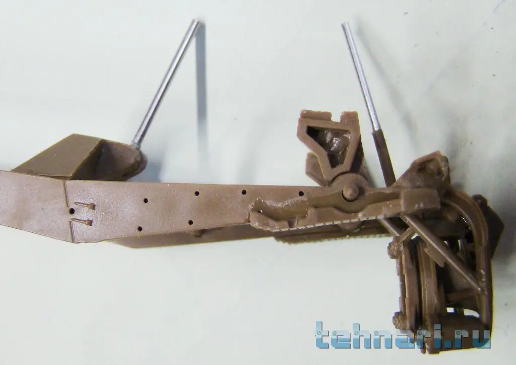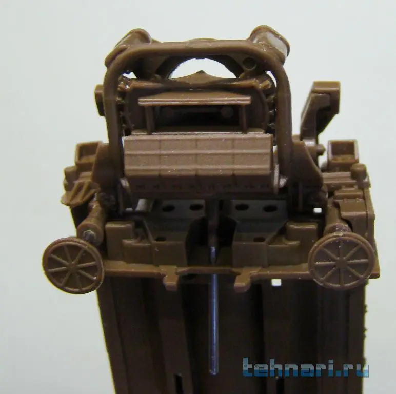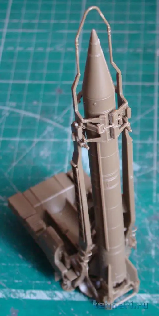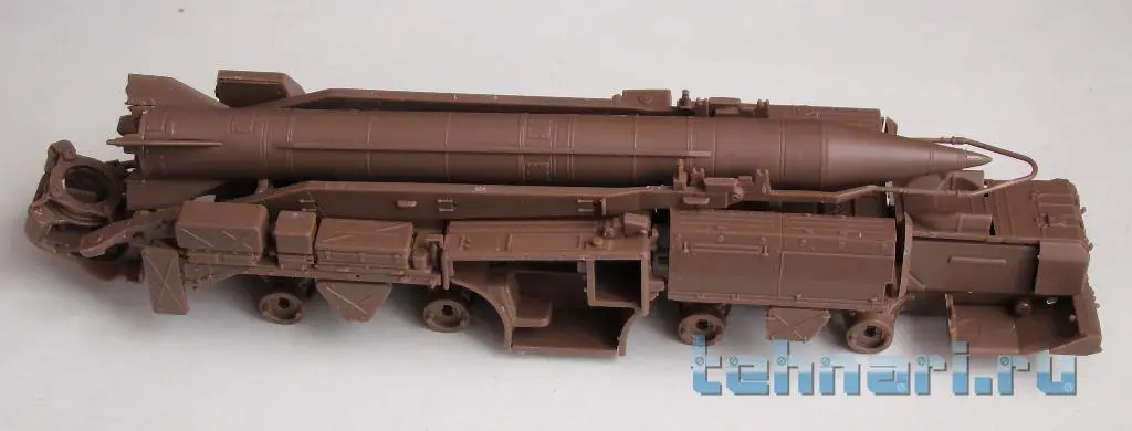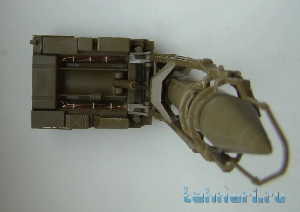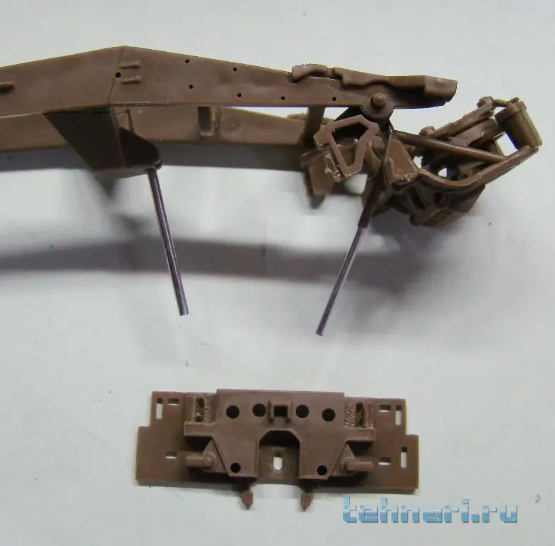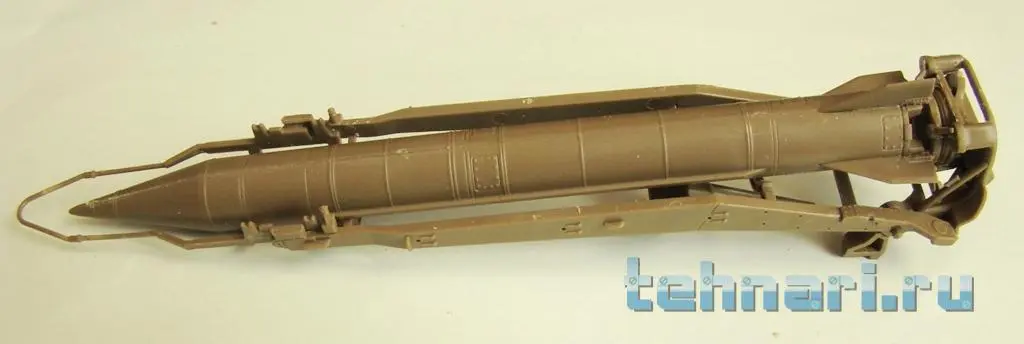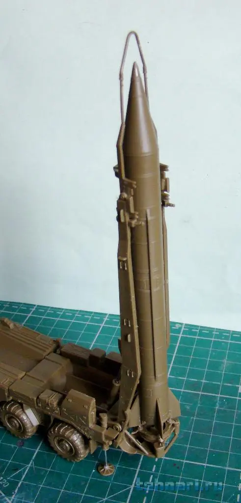 Сборка рампы начинается со сборки узла ее крепления к штоку гидроцилиндра подъема рампы. Затем из составляющих деталей и склеенного узла собирается вся рампа и соединяется через шарнирное крепление с поворотной рамой стартового стола. На крайних фото ракета установлена на рампе, рампа примерена на корпус автомобиля.