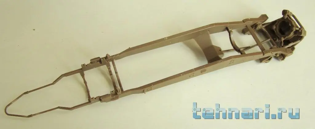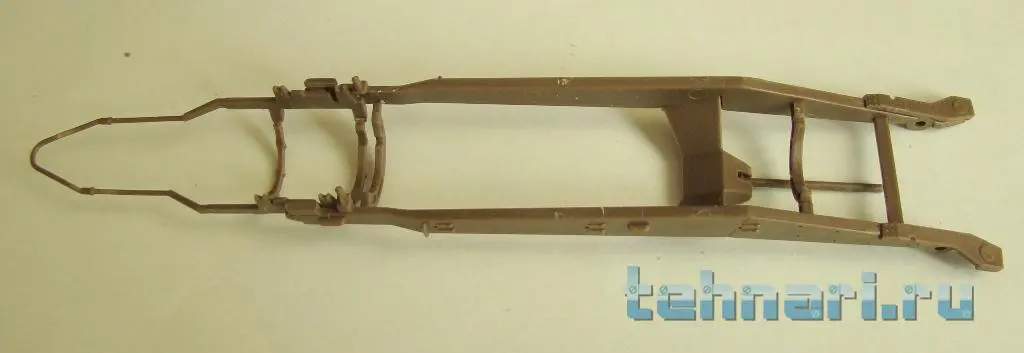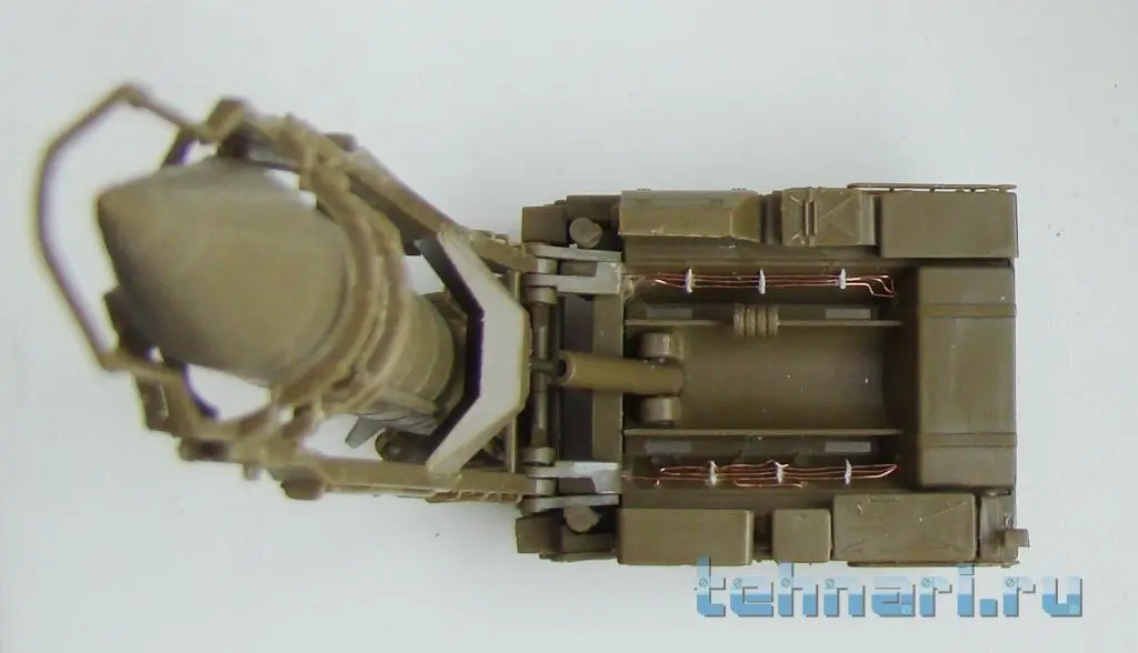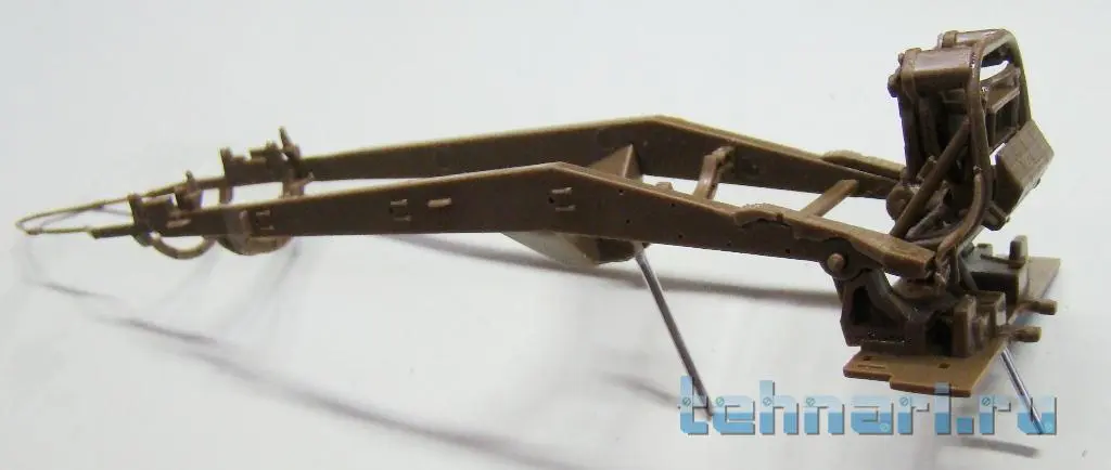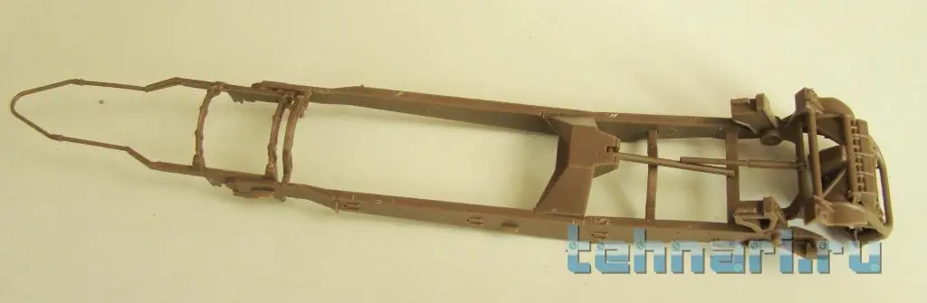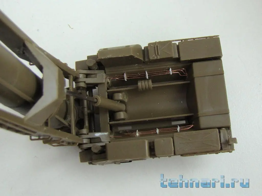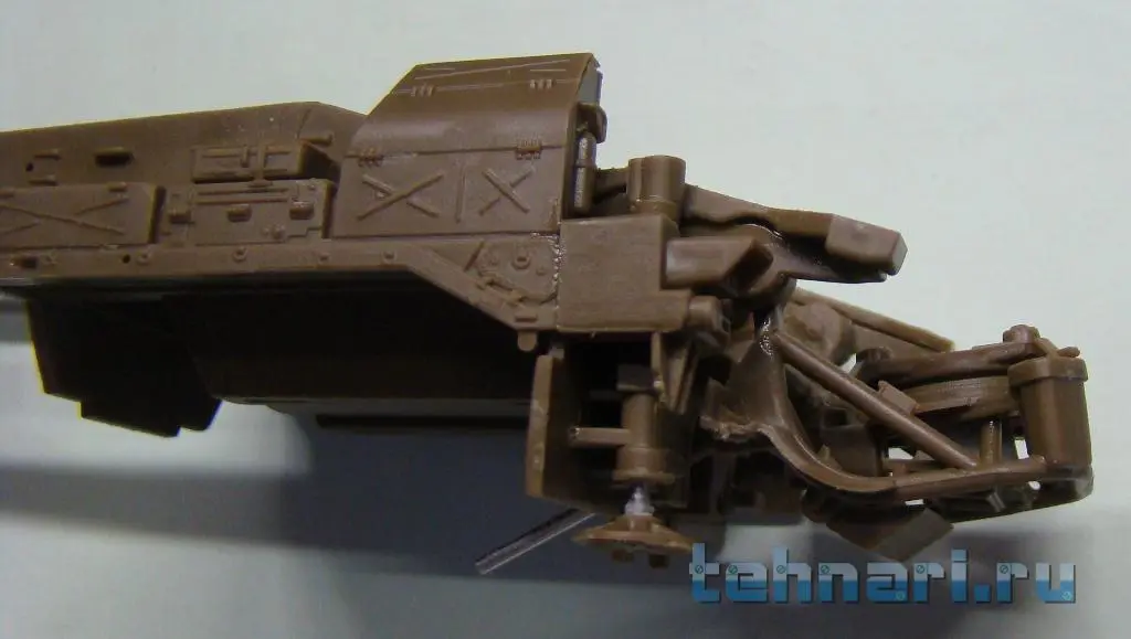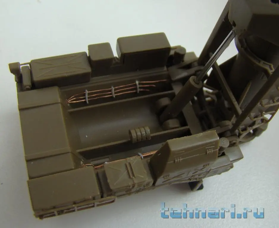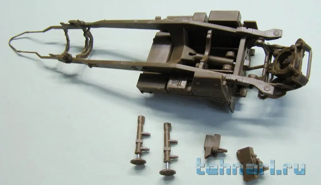 Сборка рампы начинается со сборки узла ее крепления к штоку гидроцилиндра подъема рампы. Затем из составляющих деталей и склеенного узла собирается вся рампа и соединяется через шарнирное крепление с поворотной рамой стартового стола. На крайних фото ракета установлена на рампе, рампа примерена на корпус автомобиля.
