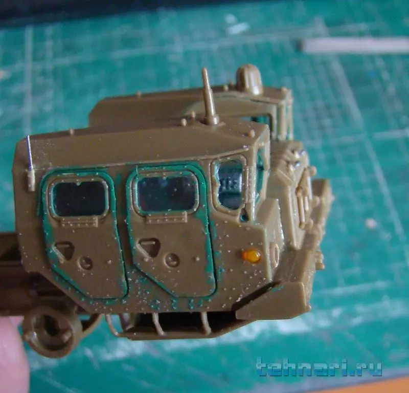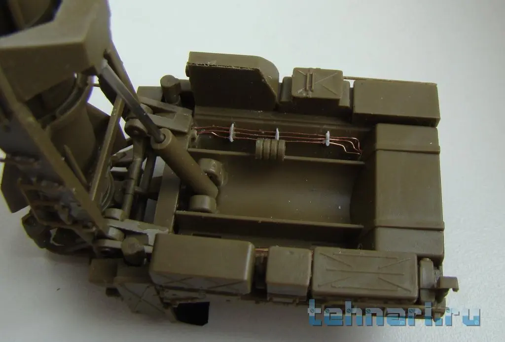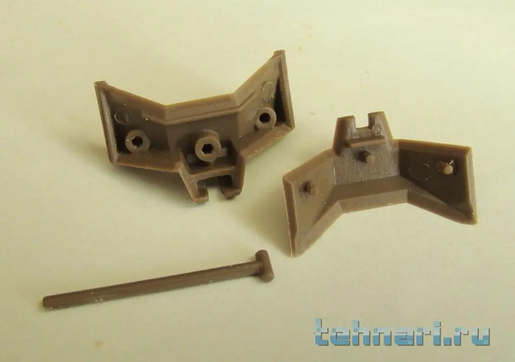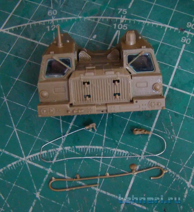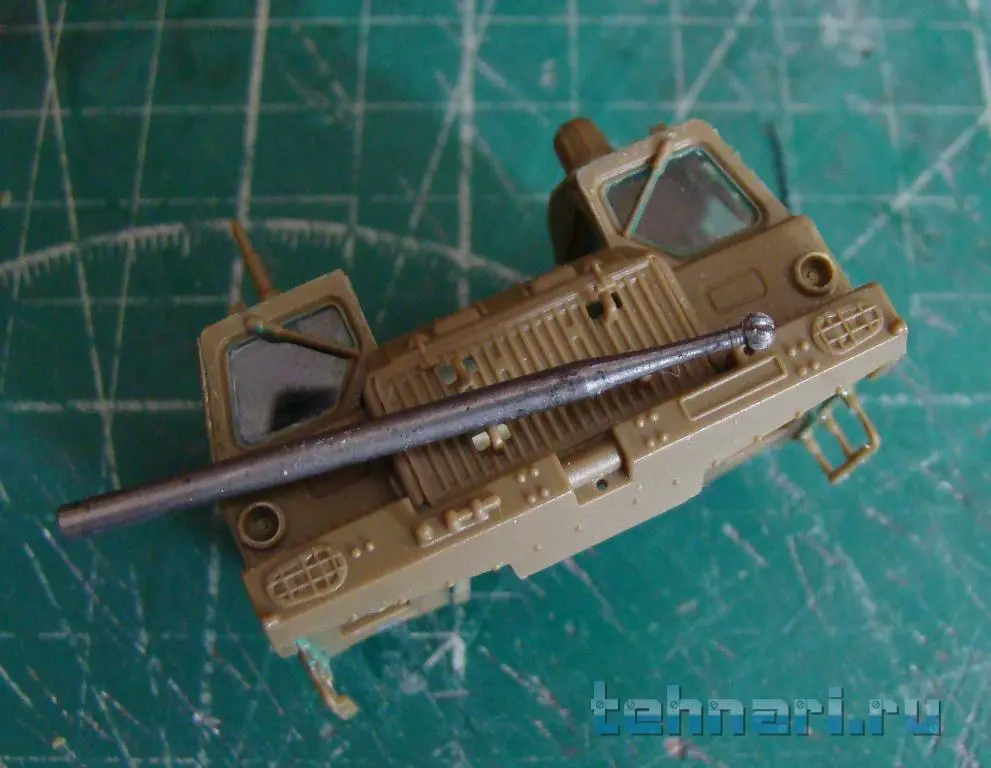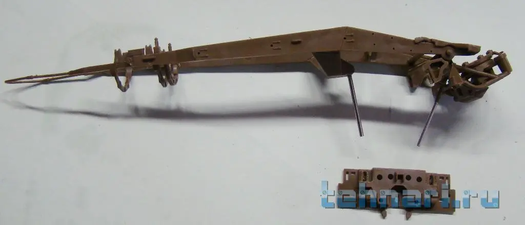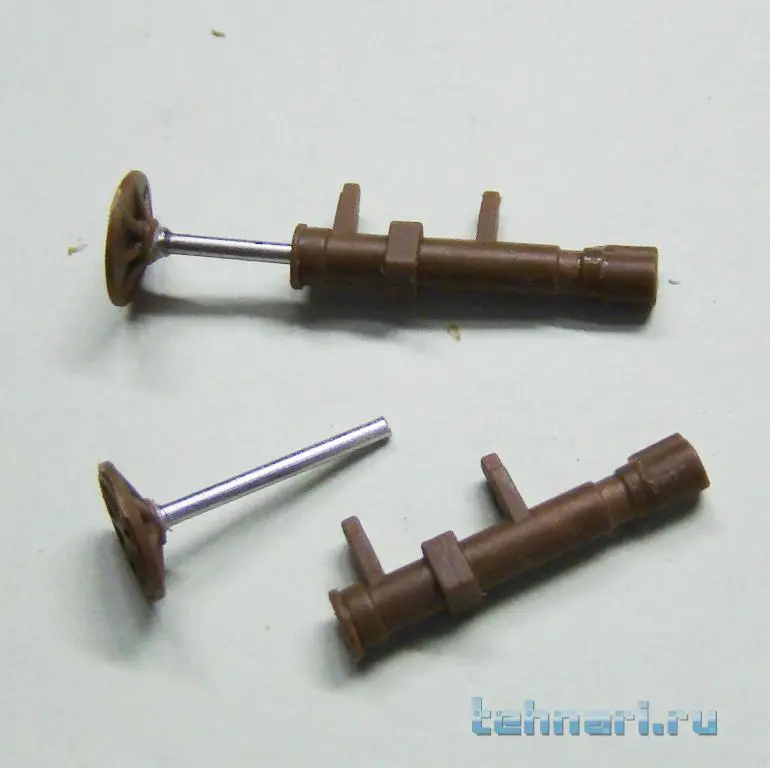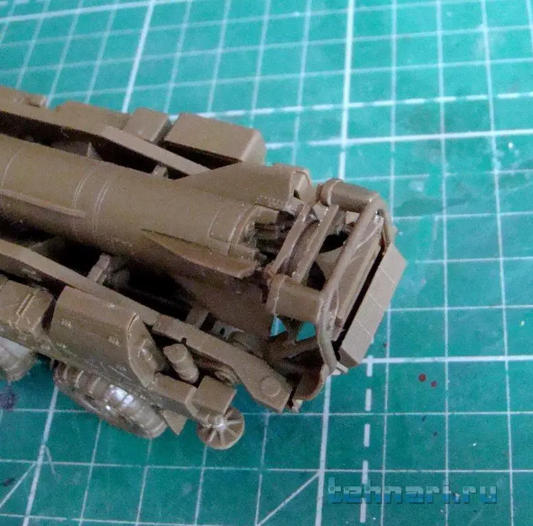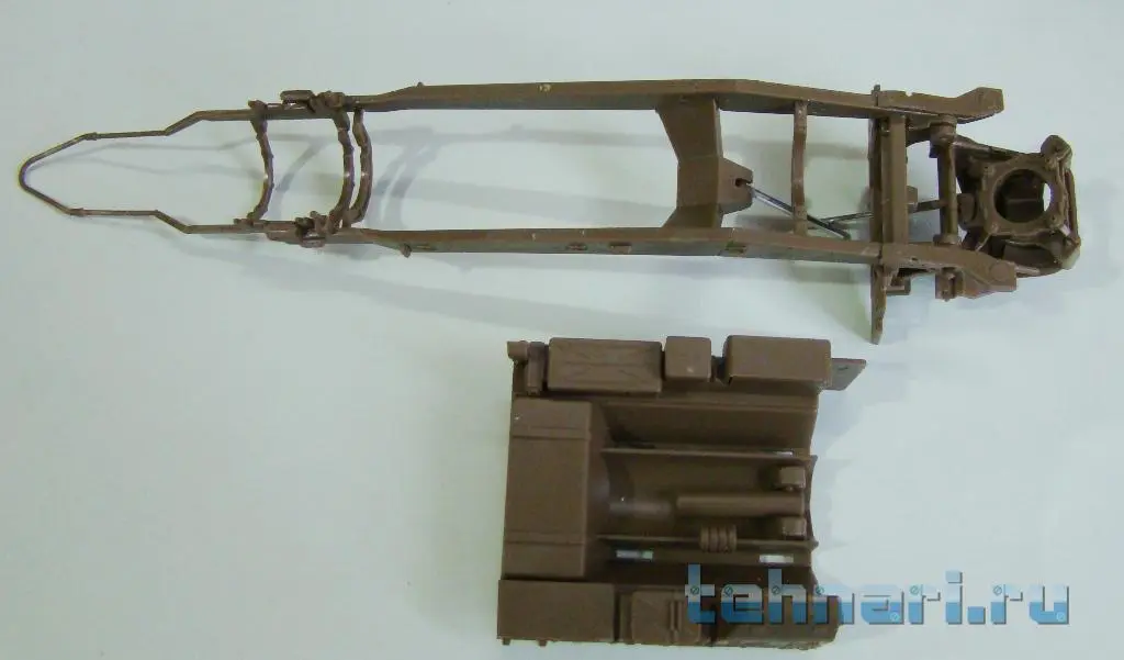 Сборка рампы начинается со сборки узла ее крепления к штоку гидроцилиндра подъема рампы. Затем из составляющих деталей и склеенного узла собирается вся рампа и соединяется через шарнирное крепление с поворотной рамой стартового стола. На крайних фото ракета установлена на рампе, рампа примерена на корпус автомобиля.