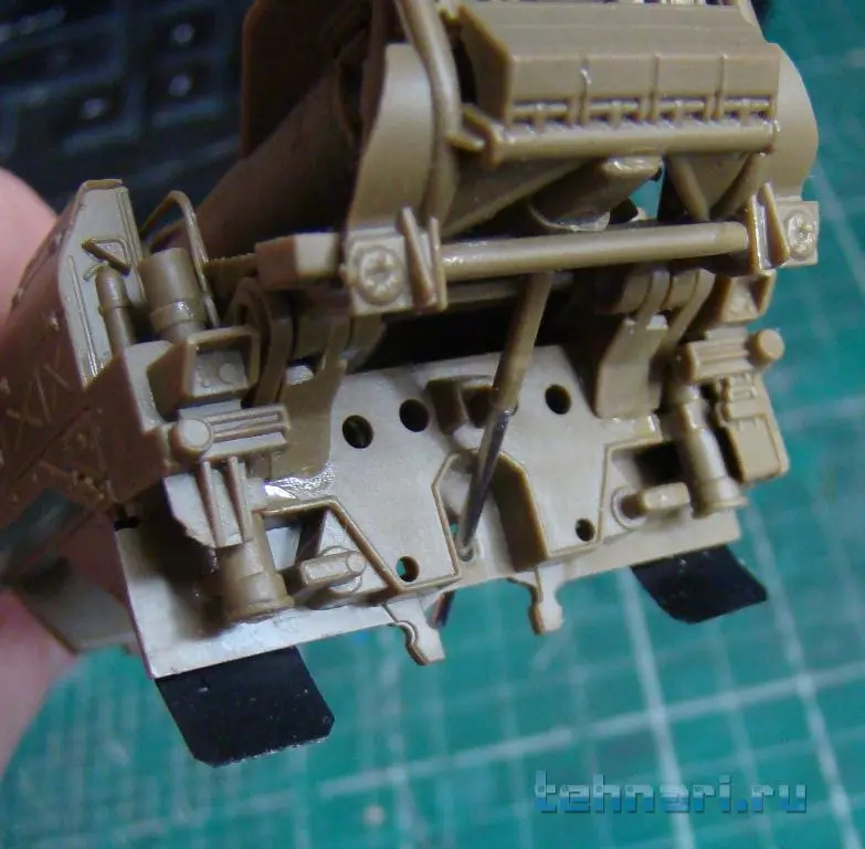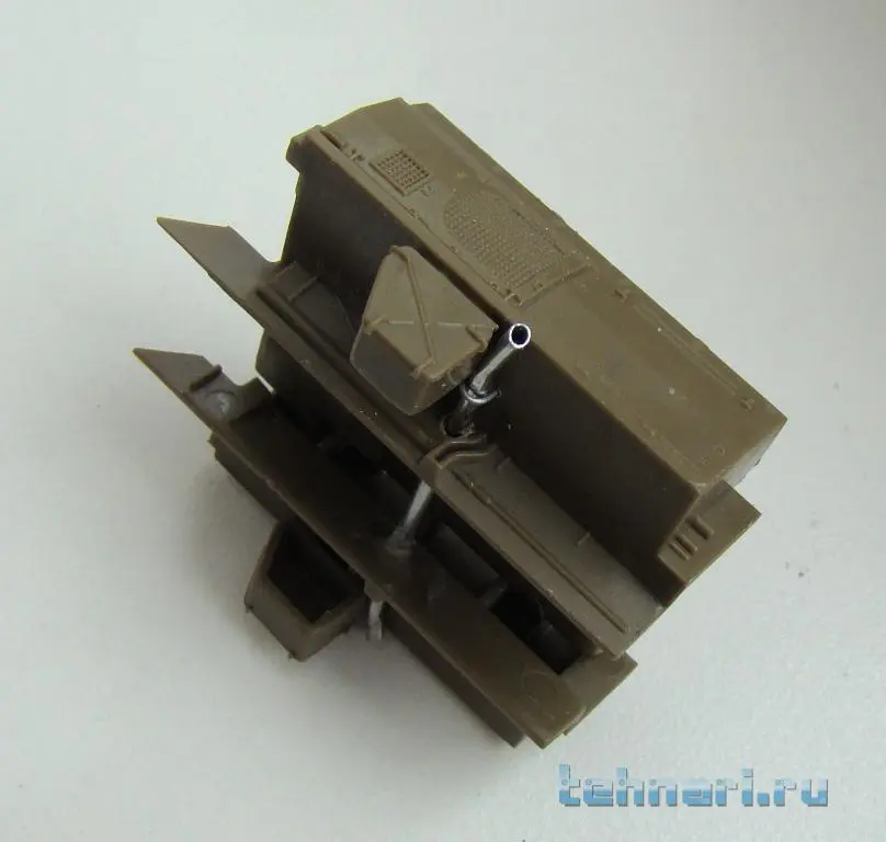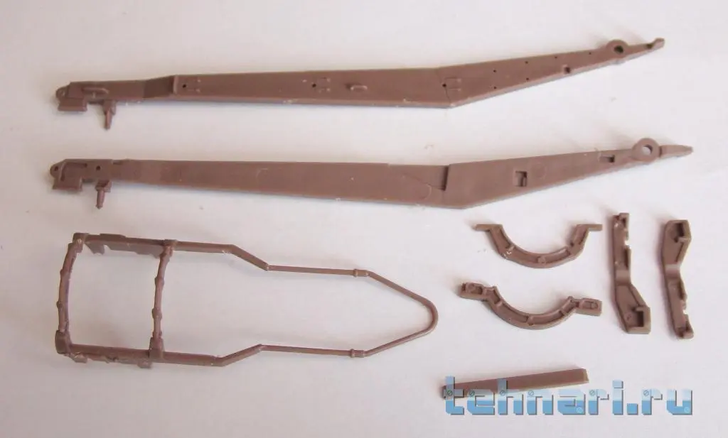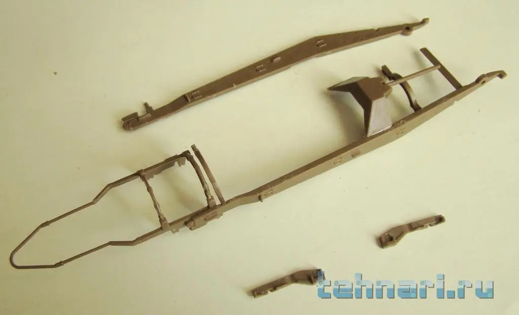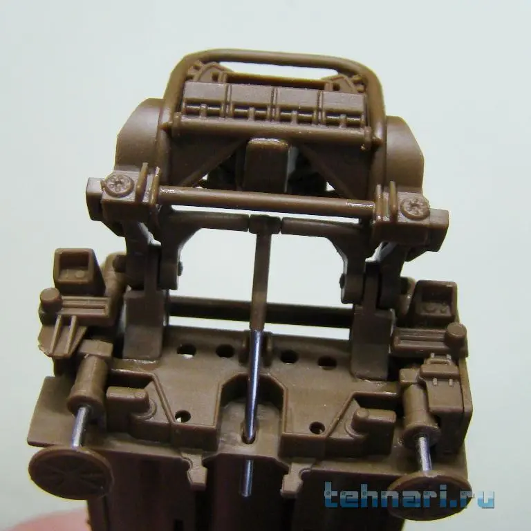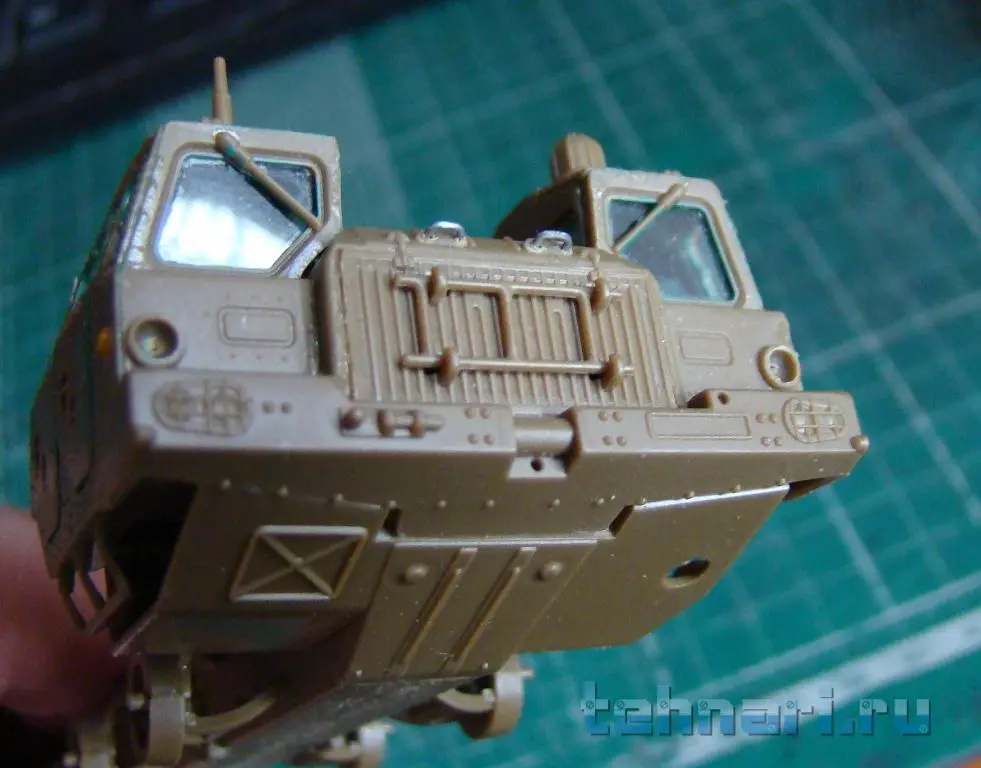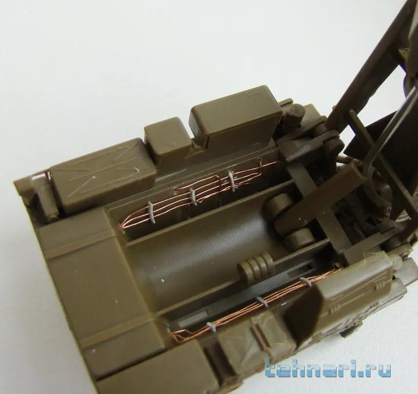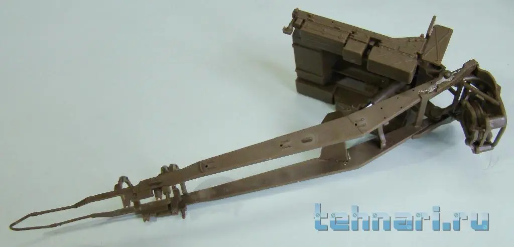 Сборка рампы начинается со сборки узла ее крепления к штоку гидроцилиндра подъема рампы. Затем из составляющих деталей и склеенного узла собирается вся рампа и соединяется через шарнирное крепление с поворотной рамой стартового стола. На крайних фото ракета установлена на рампе, рампа примерена на корпус автомобиля.