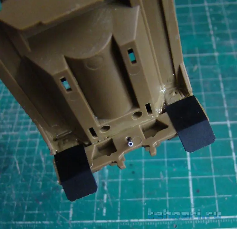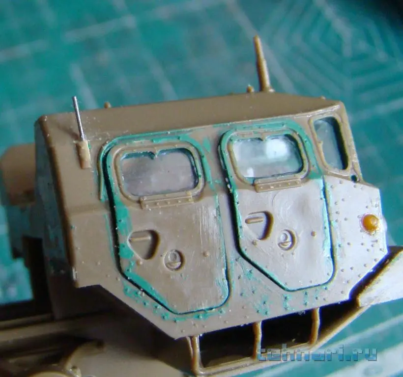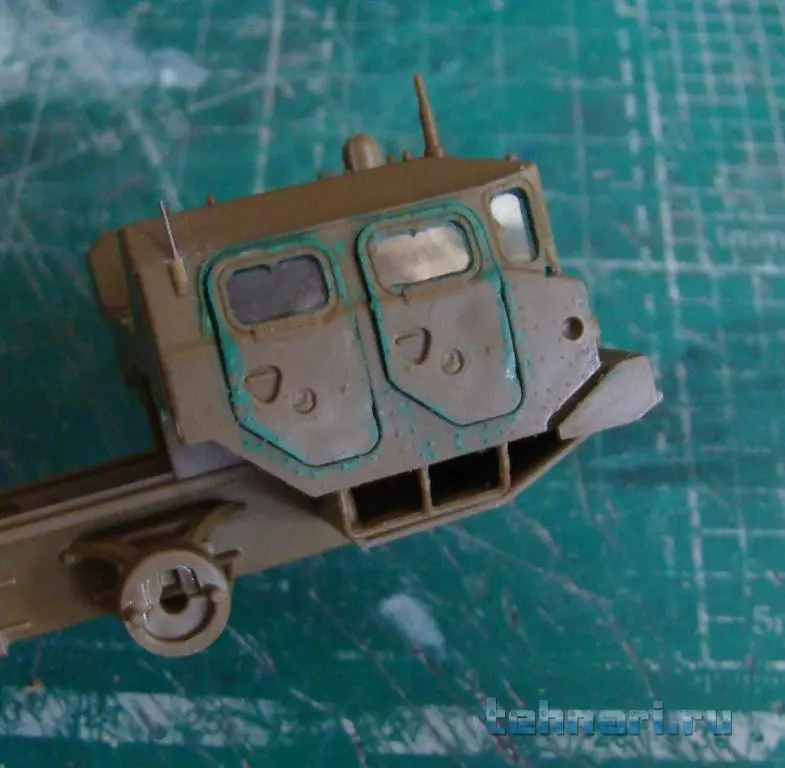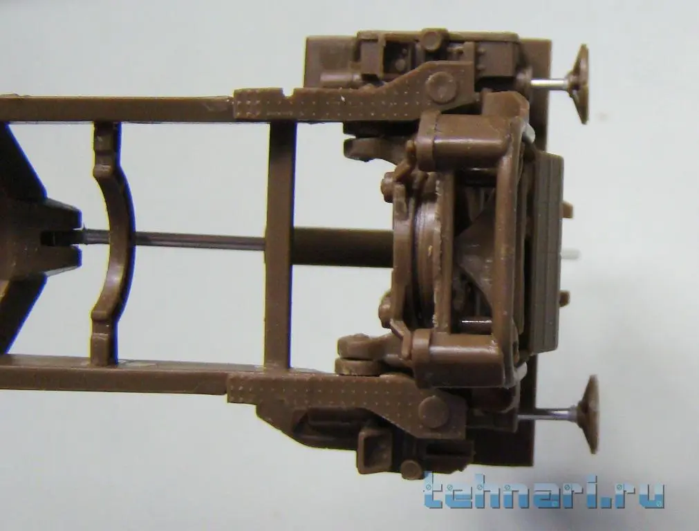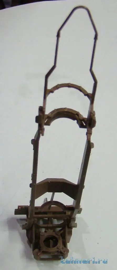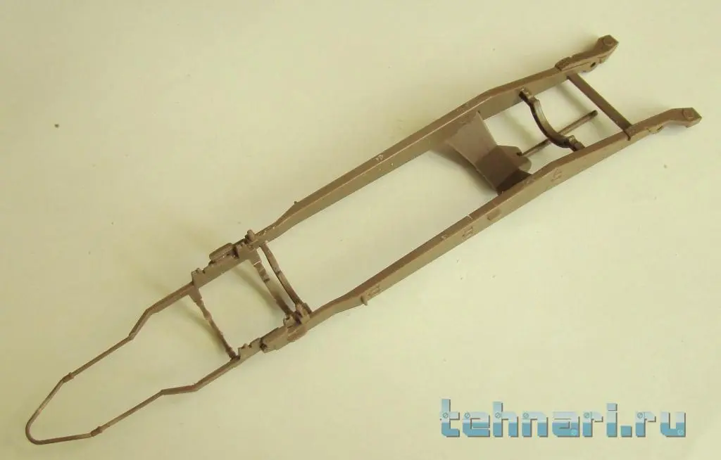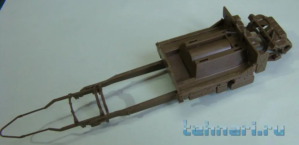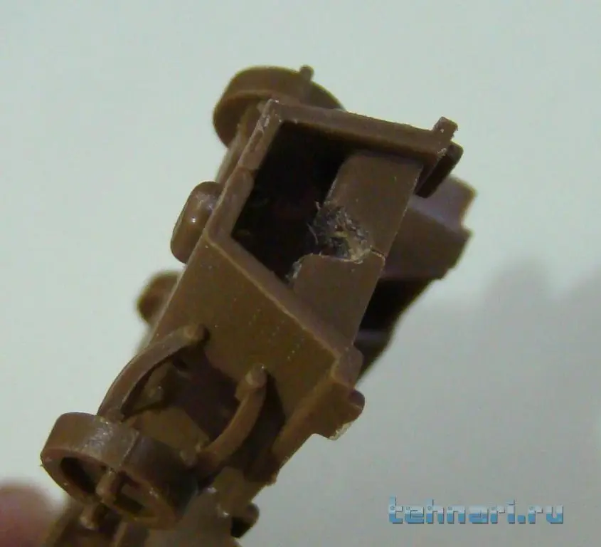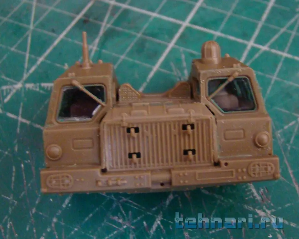 Сборка рампы начинается со сборки узла ее крепления к штоку гидроцилиндра подъема рампы. Затем из составляющих деталей и склеенного узла собирается вся рампа и соединяется через шарнирное крепление с поворотной рамой стартового стола. На крайних фото ракета установлена на рампе, рампа примерена на корпус автомобиля.