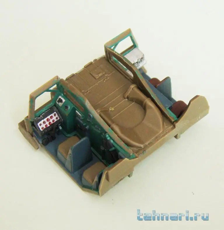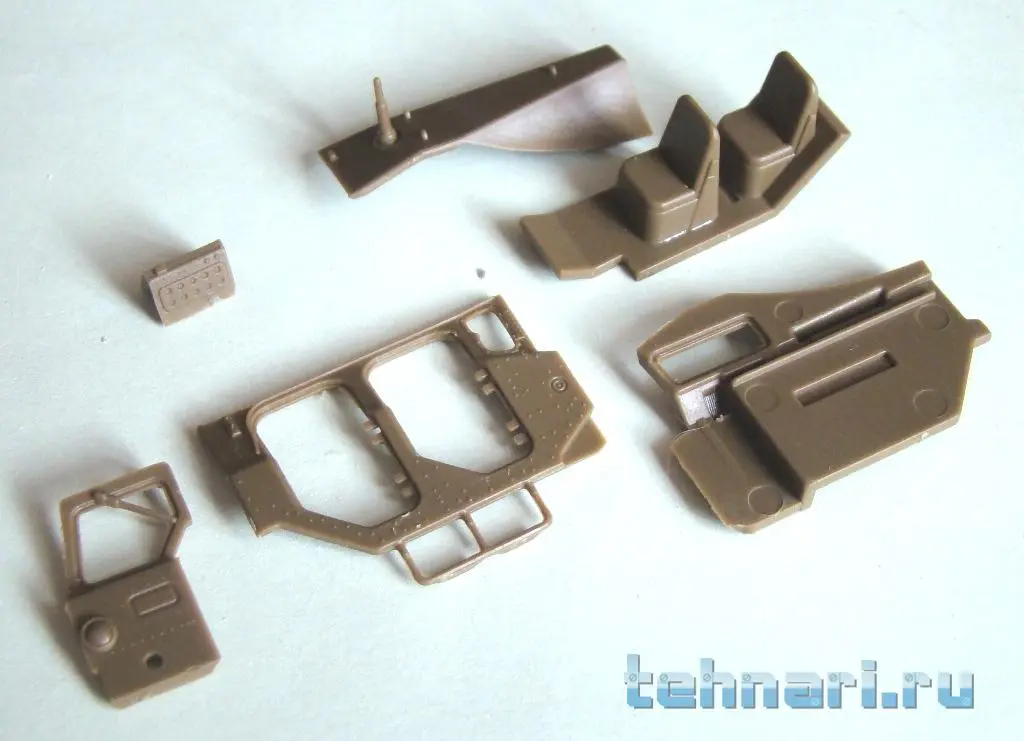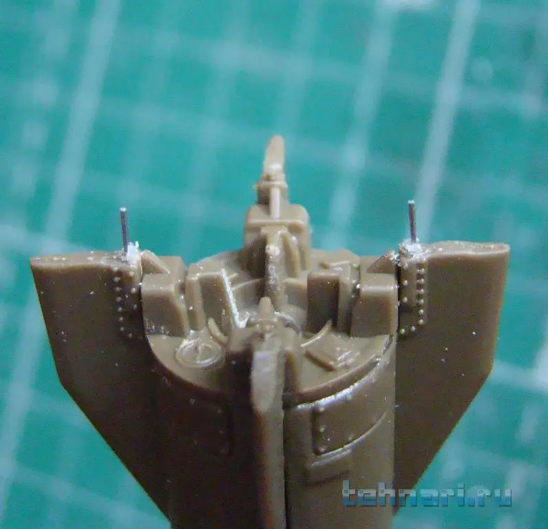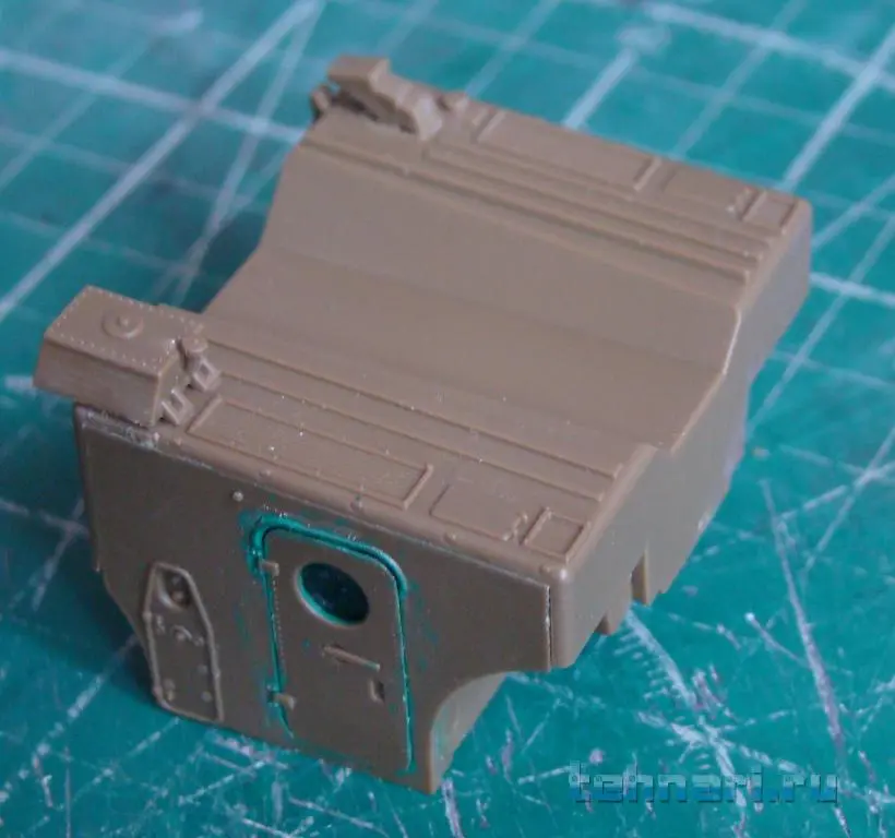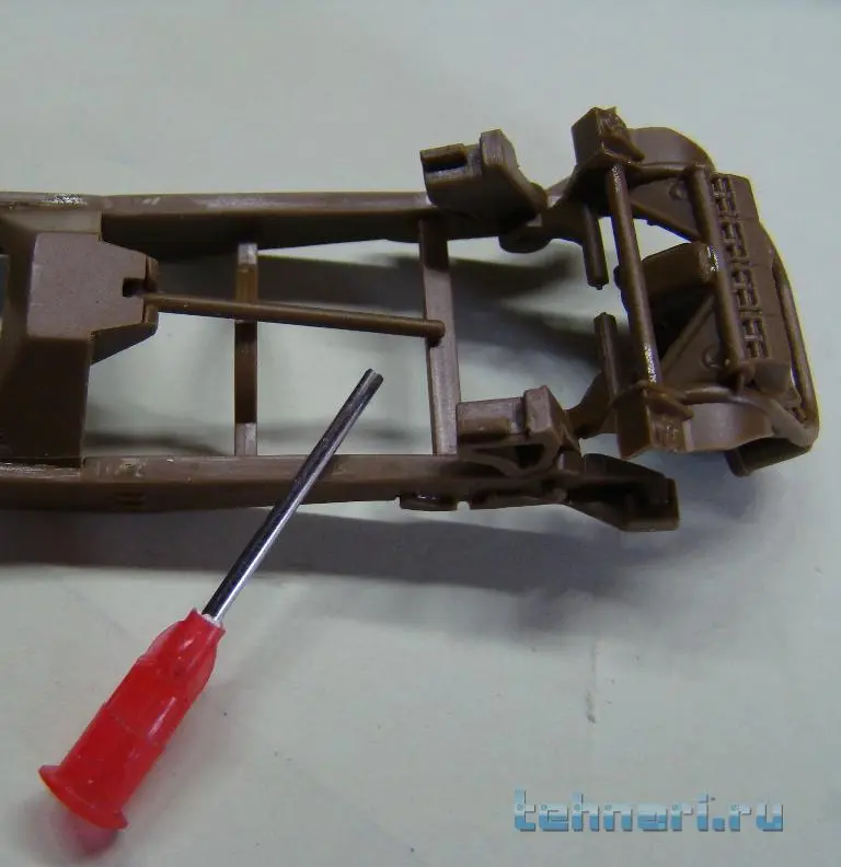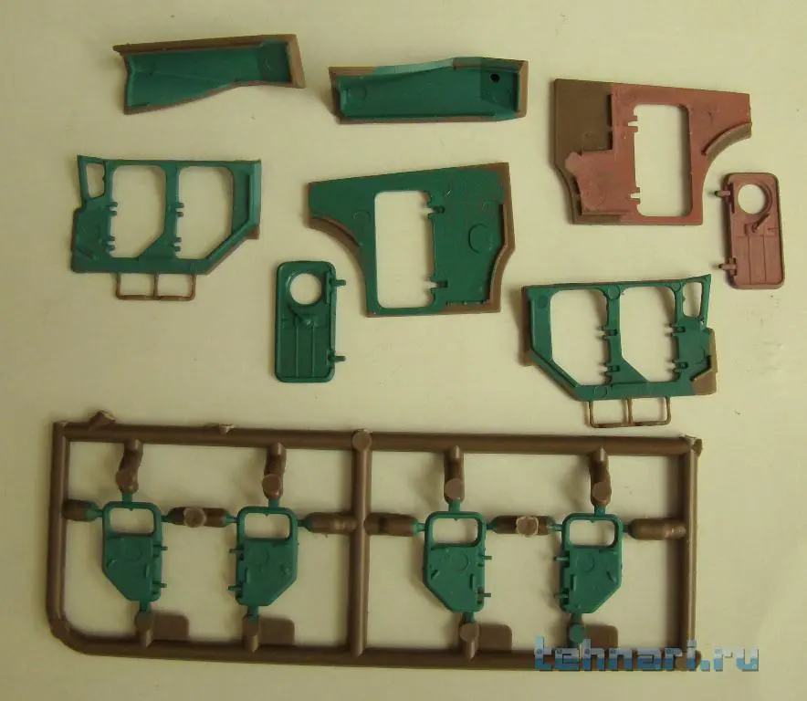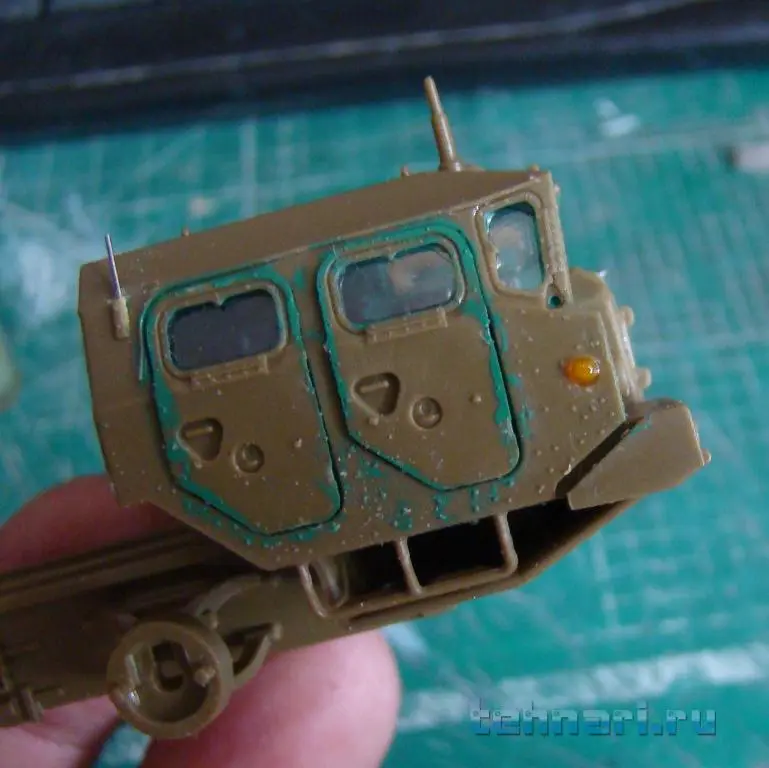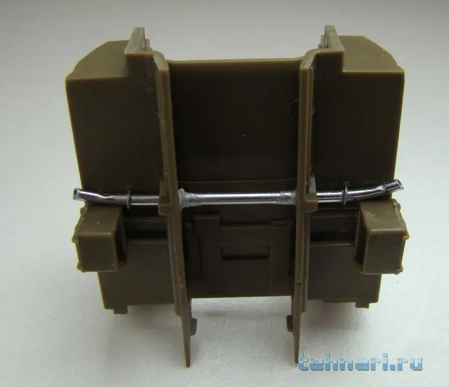 Сборка рампы начинается со сборки узла ее крепления к штоку гидроцилиндра подъема рампы. Затем из составляющих деталей и склеенного узла собирается вся рампа и соединяется через шарнирное крепление с поворотной рамой стартового стола. На крайних фото ракета установлена на рампе, рампа примерена на корпус автомобиля.