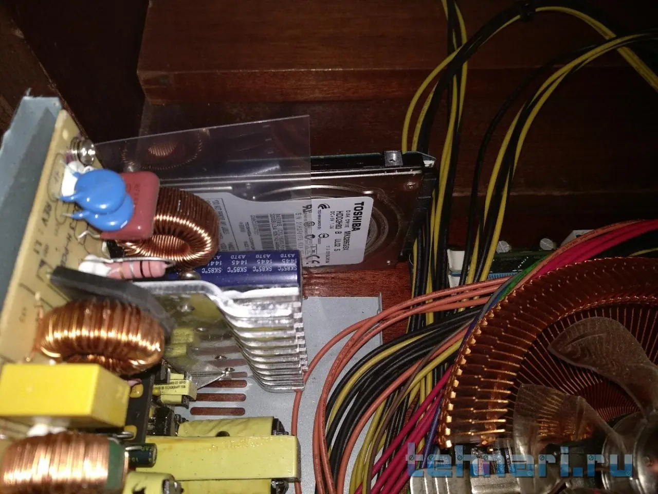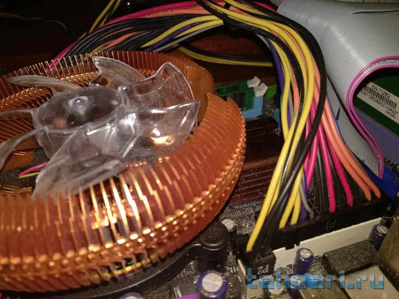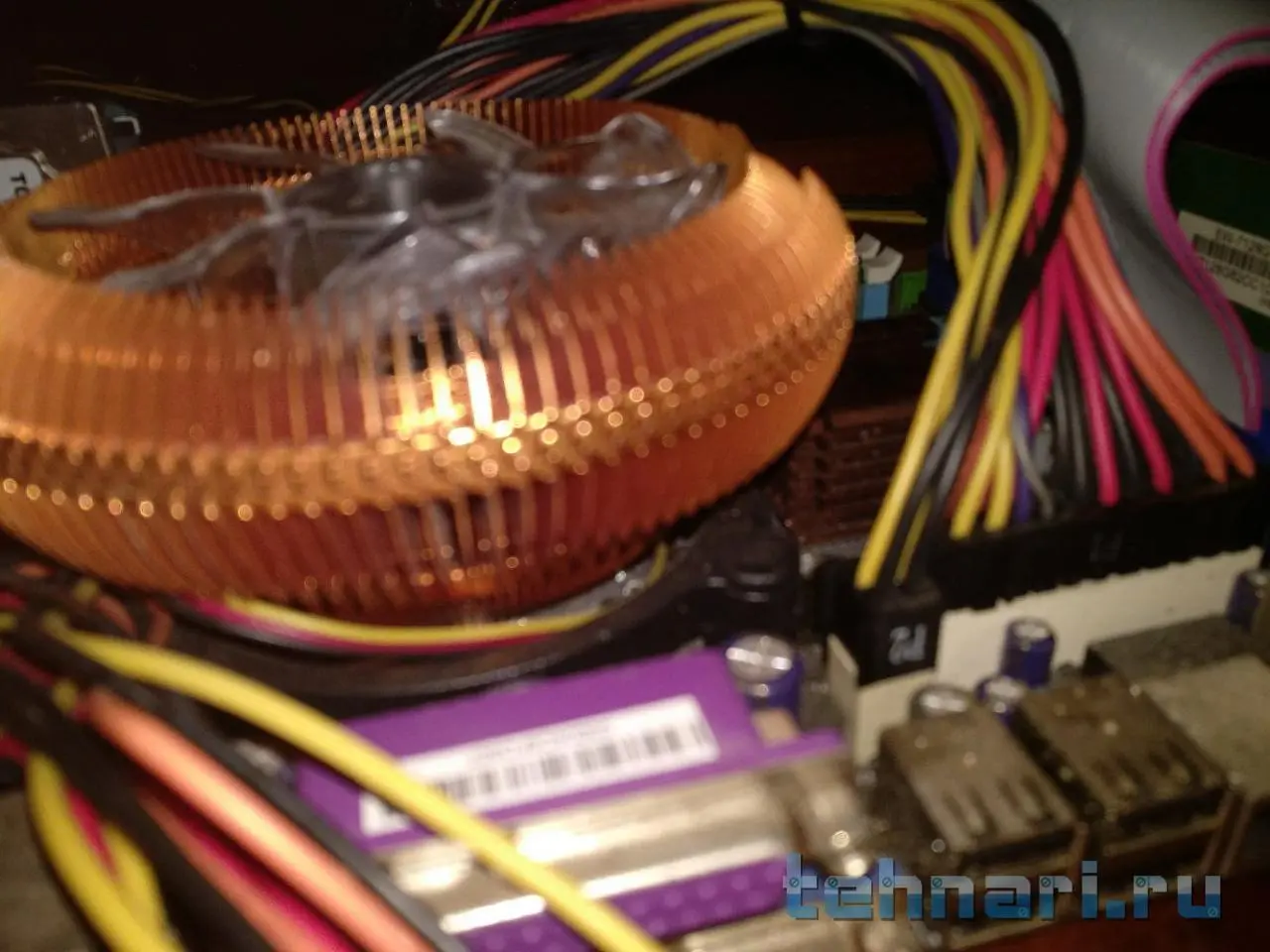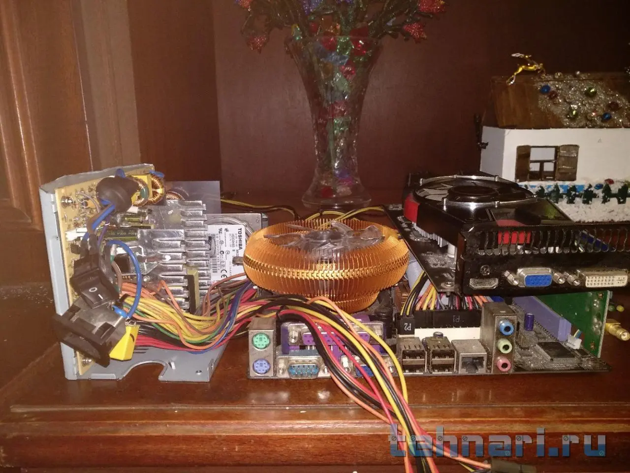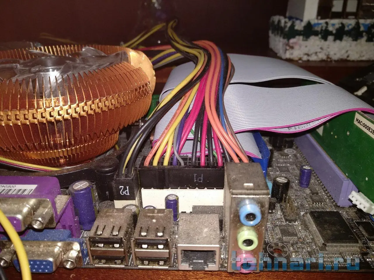 В этой конфигурации у меня радиатор северного моста (он находится между слотом видеокарты и процессором) будет завален проводами которые в свою очередь будут прижаты сверху видеокартой. Между радиаторами блока питания и радиатором ЦП тоже будет пролегать пучок проводов от блока питания (хотя если это имеет значение плату блока питания можно повернуть пучком проводов назад) . Куллер блока питания (там стоял 12см 12вольт 0.4а) удален, его планируется заменить 8см куллером , который по совместительству будет винтелировать системник.