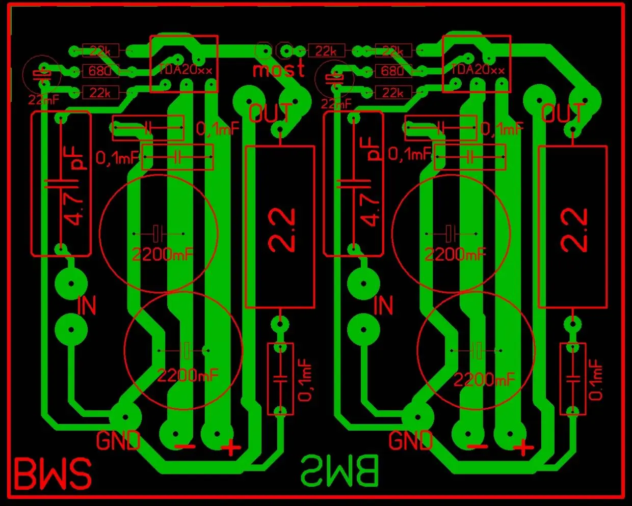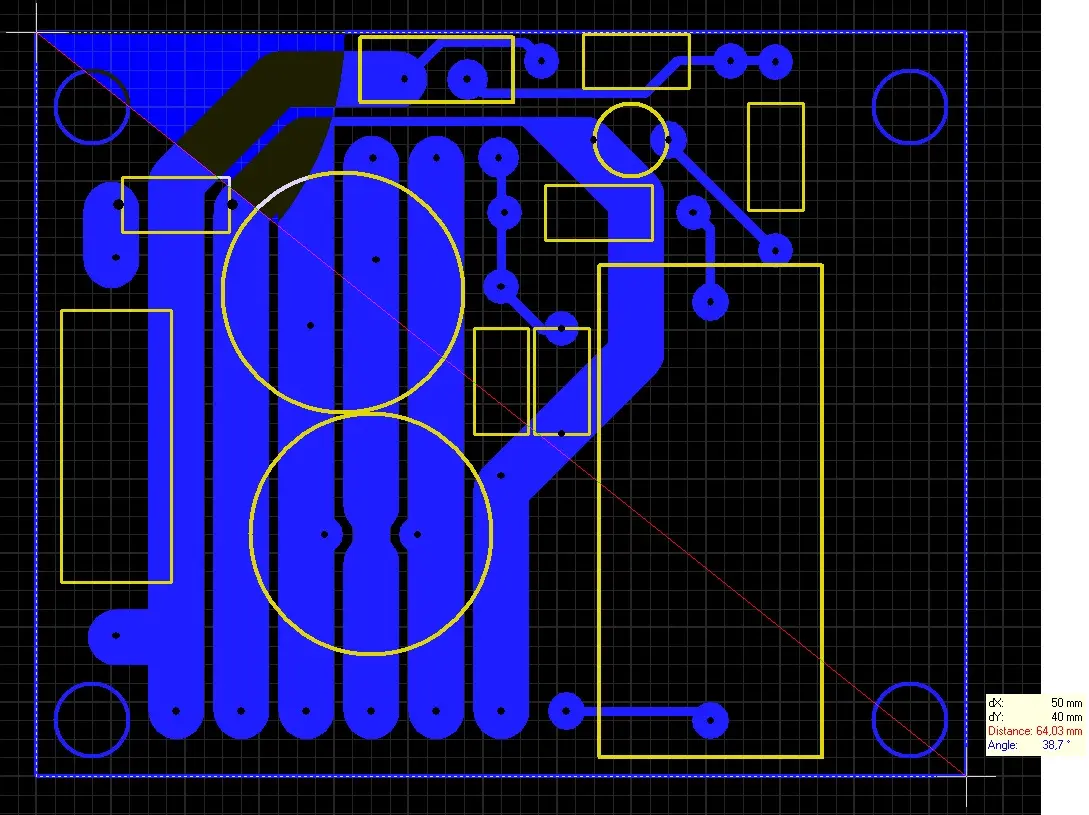 Не много покритикую. Конденсаторы по 0,1 мкФ у ног питания не нужны, лучше ближе придвинуть электролиты. Тем самым укоротятся шины питания, следовательно их индуктивность. Шину общего силового следует сделать значительно шире.
