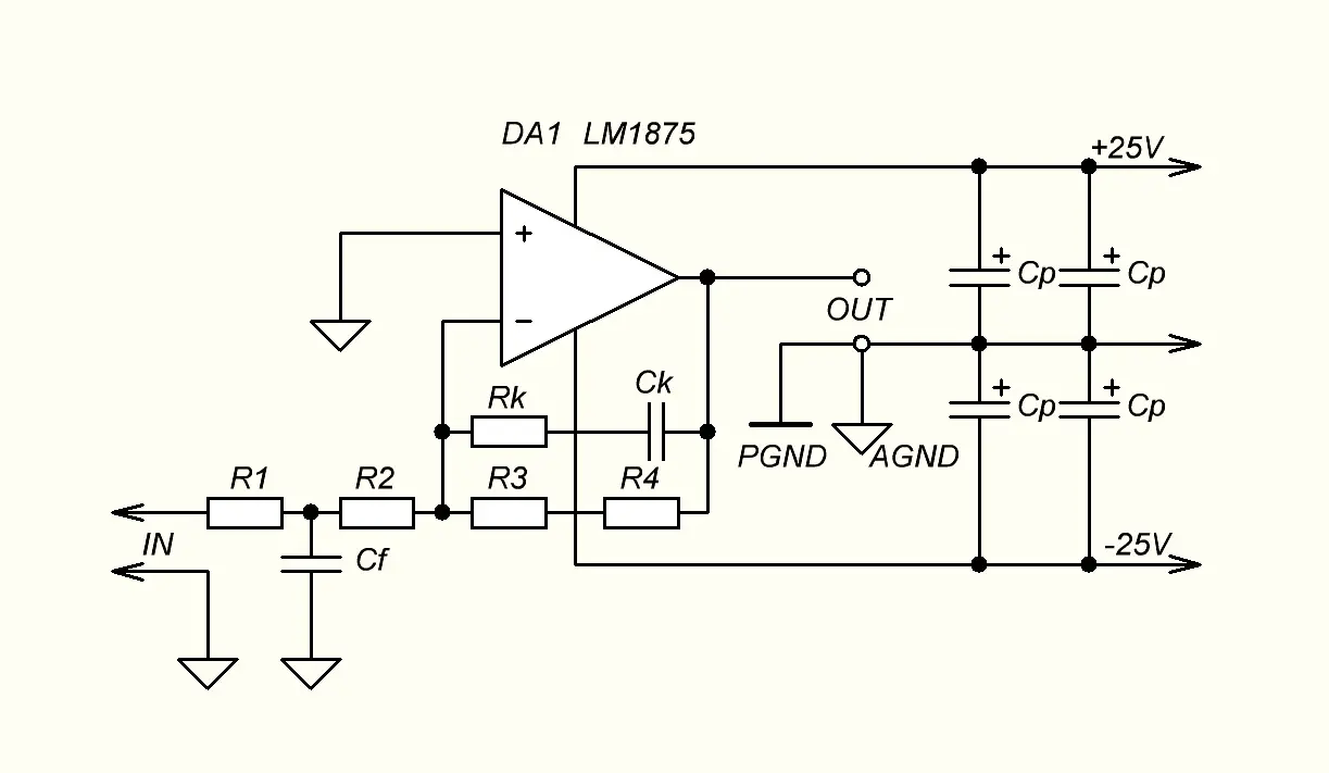 равный: U=Iib(R3+R4). Входной ток LM1875 - 0,2 uV, сумму сопротивлений примем равной стандартному - 22 kOhm. При этом напряжение на выходе составит чуть более 4 mV.