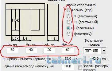 С левой стороны надо выбрать тип сердечника и указать размеры)