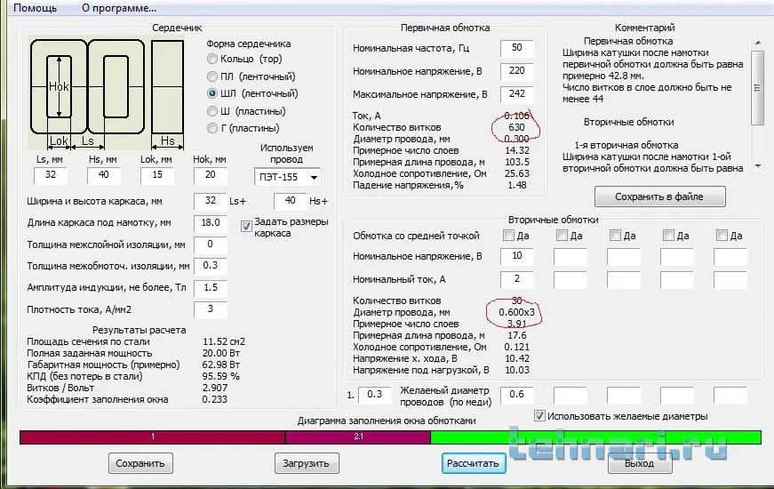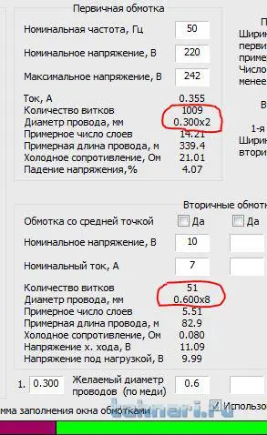 Мысля такая: зачем считать Гууууглом, если есть замечательная программка для расчёта трансформаторов? А по диаметрам - смотри таблицу и считай сам сколько надо жил