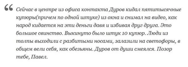 заявила пользовательница ЖЖ Манечка Ушакова."Набережная канала Грибоедова, из окон офиса ВК выглядывает Павел и Ко, начинается швыряние 5000 купюр, и с надменной королевской ухмылкой он наблюдает за тем, как толпа начинает рвать друг друга в надежде поймать "дары" "повелителя"! Настоящий питерский цирк имени Дурова"