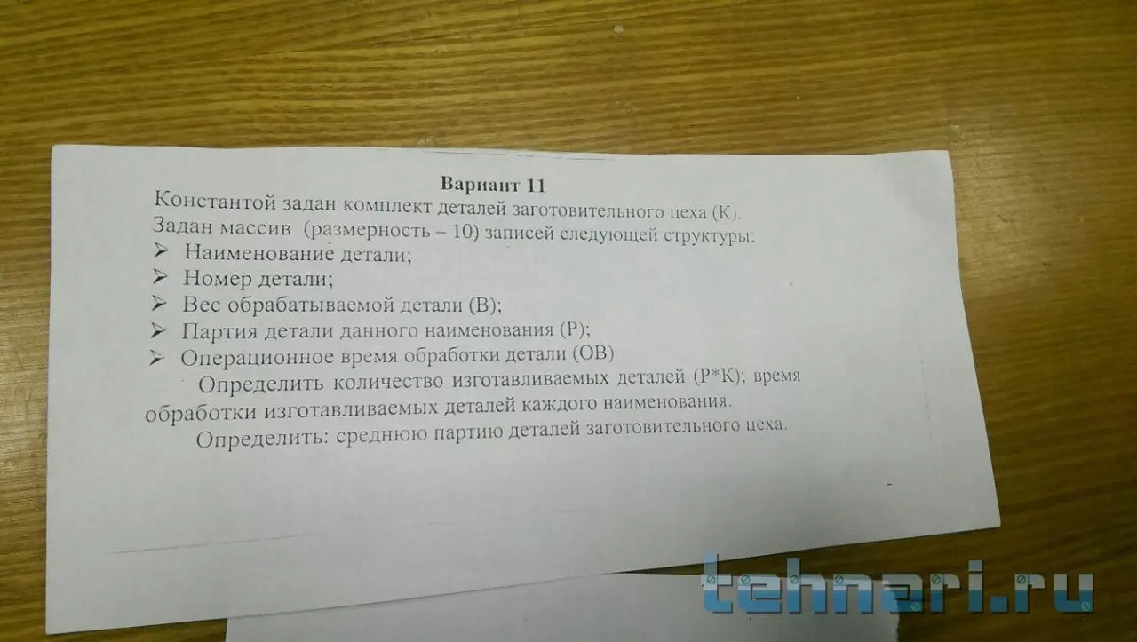 Константой задан комплект деталей заготовительного цеха (K). Задан массив (размерность - 10) записей следующей структуры