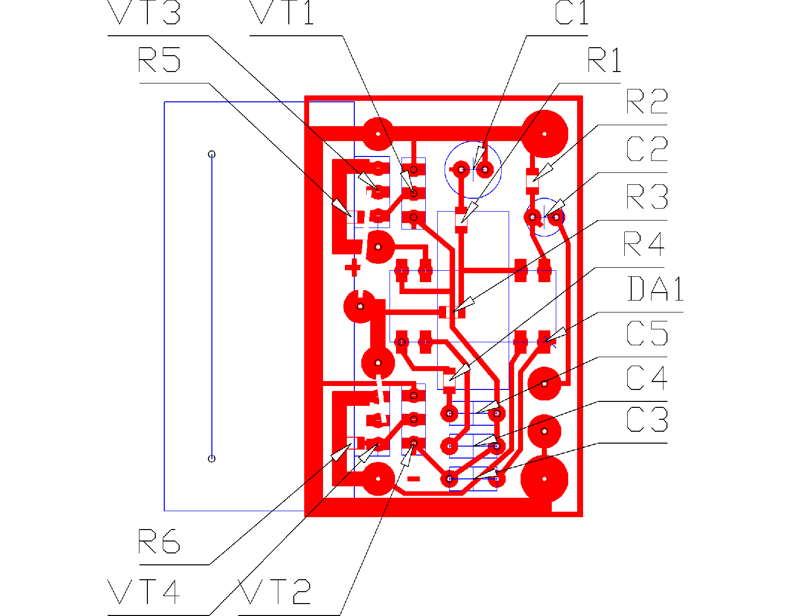 Всем привет, помогите нарисовать печатку для усилителя на вышеупомянутой микре и транзисторах. Есть печатка, в той же статье откуда схема взята, но печатка непонятная и вызывает у меня сомнения в своей правильности, тем более что нарисована под smd элементы