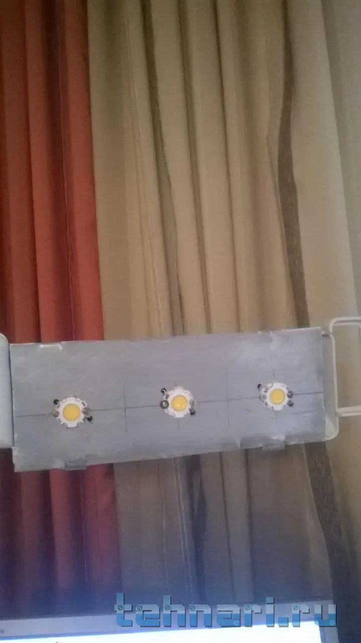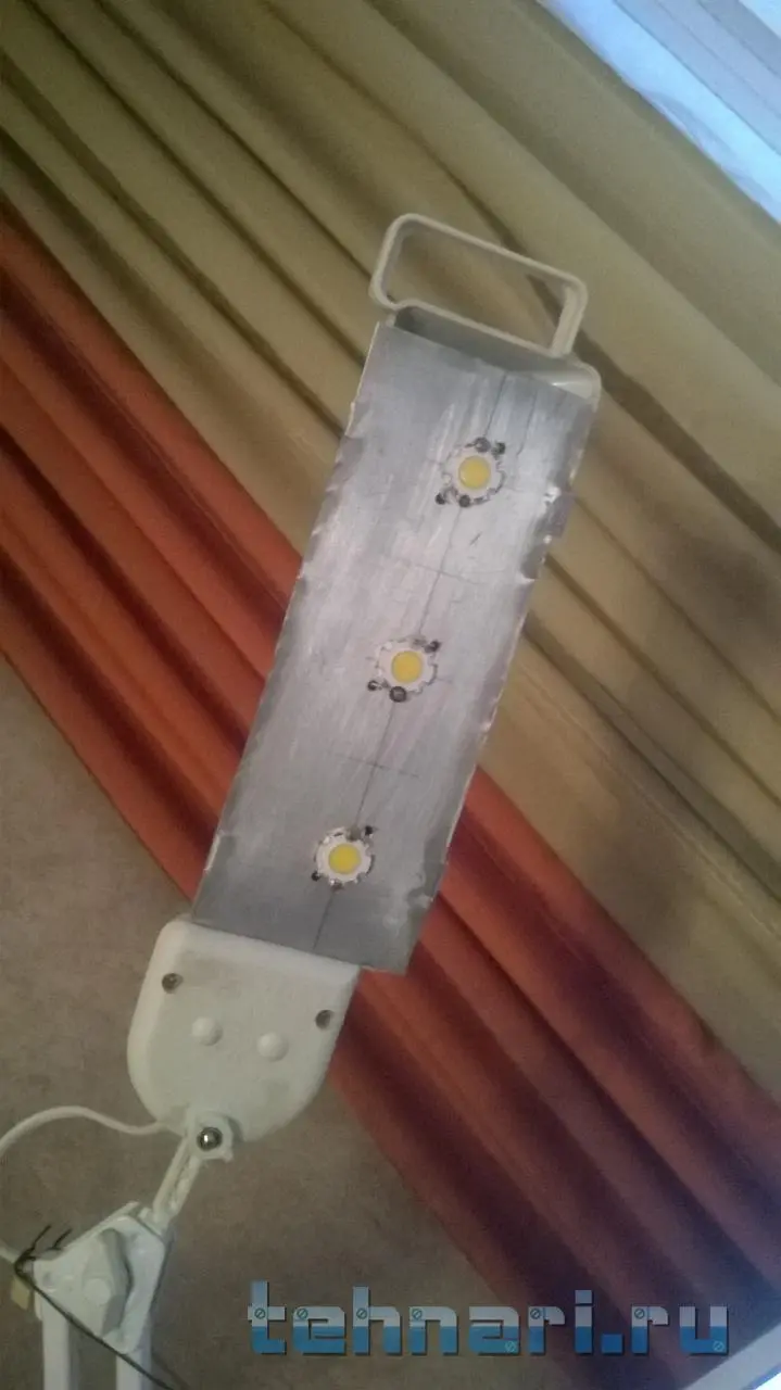 Привет всем ,,переделал это три года назад .Светодиоды взял по 3 ватта прикрутил на алюминиевый лист 2 мм на термопасту ,соединил последовательно и посадил на драйвер 12 ватт 220 вольт ..вилку с трансом пришлось отрезать .В качестве рассеивателя взял лист пленки от экрана ноутбука и вырезал нужный размер и засунул под алюминий . Светодиоды структуры СОР нагрев алюминеивой пластины был сильный и пришлось с тыльной стороны прикрутить радиаторы 3 штуки 3 на 3 см на термопасту.