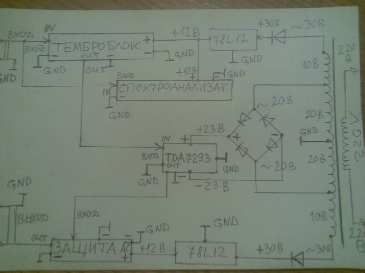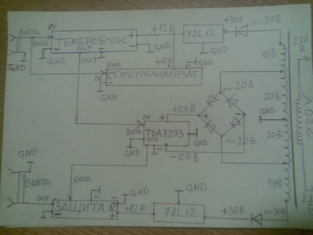 Вобщем вот сижу, пытаюсь развести питание по узлам. Задумка такая- чтобы питать всю конструкцию от одного транса: основной УНЧ на 7293 от одной вторички (+\- 23 В), а остальные блоки- Темброблок, Спектроанализатор, и Защита АС - от другой вторички ( понизить с 30 до 12 В), так как все эти узлы питаются от + 12 В ( однополярного) . Но как это все правильно подсоединить, чтобы всё фурычило???? Я вот нарисовал схему по питанию всех узлов ( в архиве). Только есть сомнения насчёт разводки земли для доп. узлов , откуда её брать ? По идее, земля должна быть общая для всей схемы, правильно ??? Тогда как это всё подключить, чтобы всё запитать от одного транса ??? Схема транса взята с оригинальной схемы. Жду помощи, друзья !!!