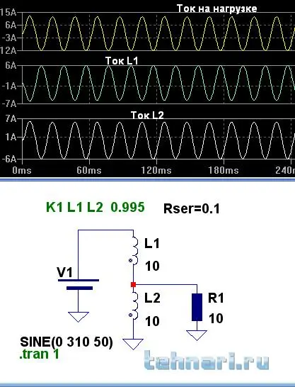 И еще автотрансформатор хорош тем, что ток L1 и L2 складывается, т.е. ток через обмотку в 2 раза меньше, чем ток нагрузки, соотв и тоньше провод можно использовать. Вот, видно по модели, что ток обмоток L1=L2=6A, а ток на нагрузку уже 12А.