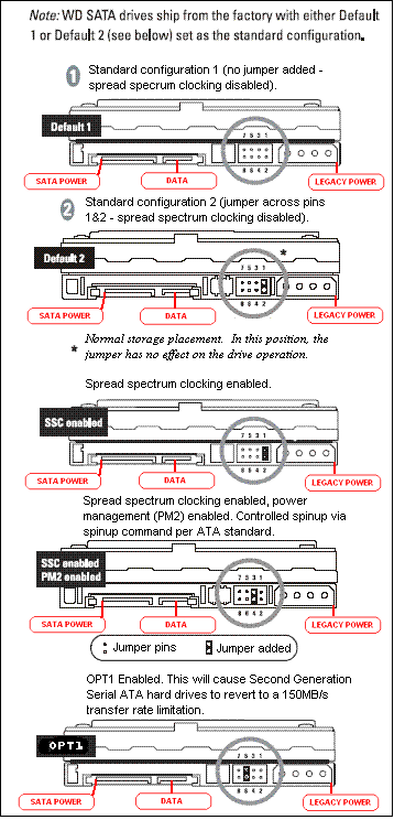 на саташном - вообще два варианта - либо перемычка стоит, и тогда ограничение по скорости включено (это если мать не поддерживает SATA II, а только SATA), либо перемычка вообще не стоит, и тогда полные три гигабита. Откуда вы взяли 4 положения, ума не приложу...