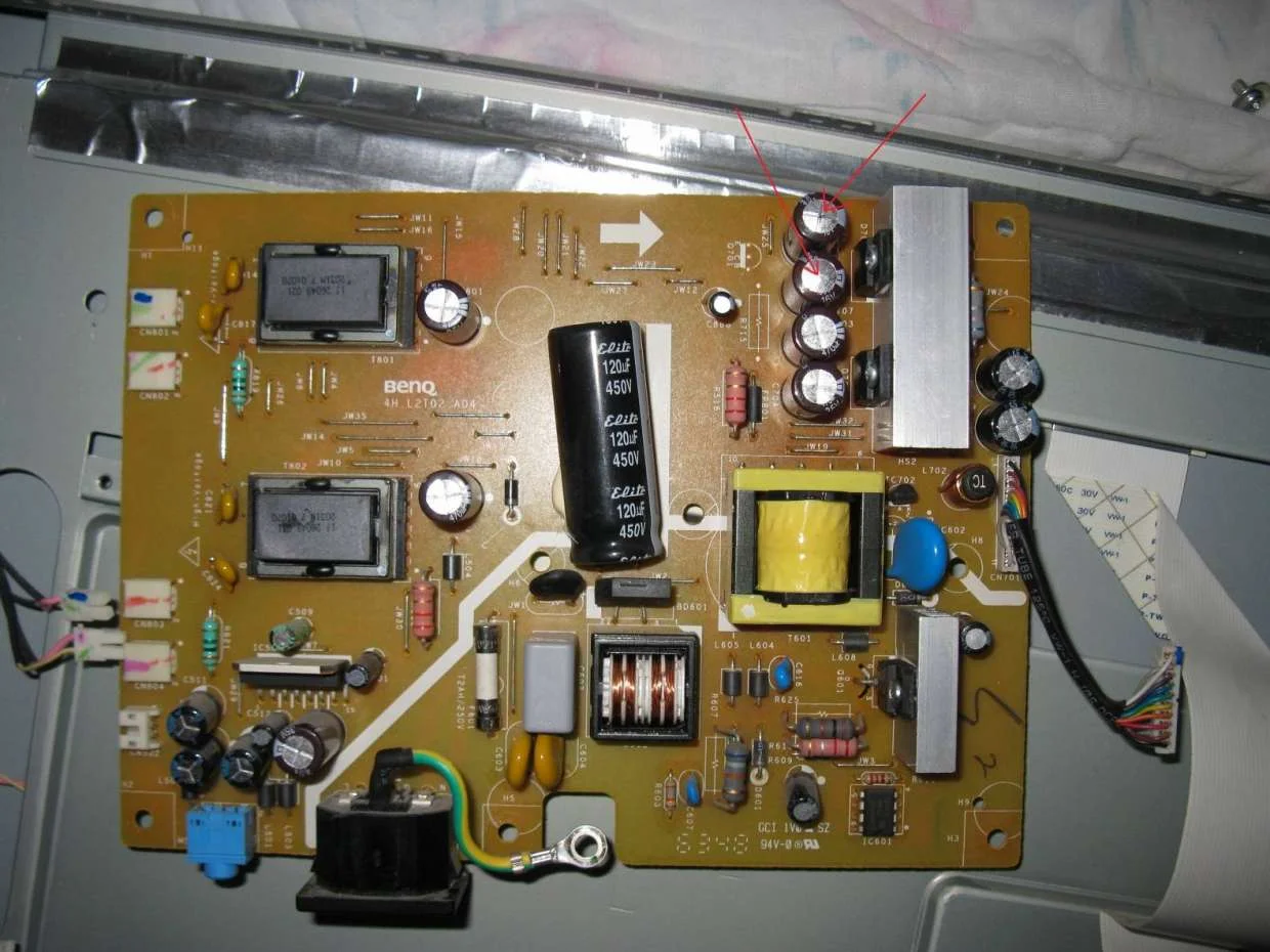 Здравствуйте! Возникла необходимость сделать небольшой ремонт монитора Benq FP93E. Который при включениии загрузке ОС начинает мерцать, появляются белые полосы. Мне подсказали, что надо поменять конденсаторы. Вскрытие показало, что два конденсатора там действительно вздулись. Конденсаторы Elite 1000uF 16V