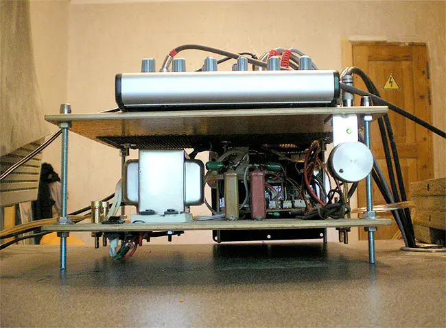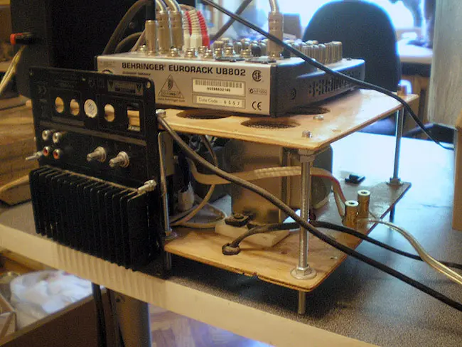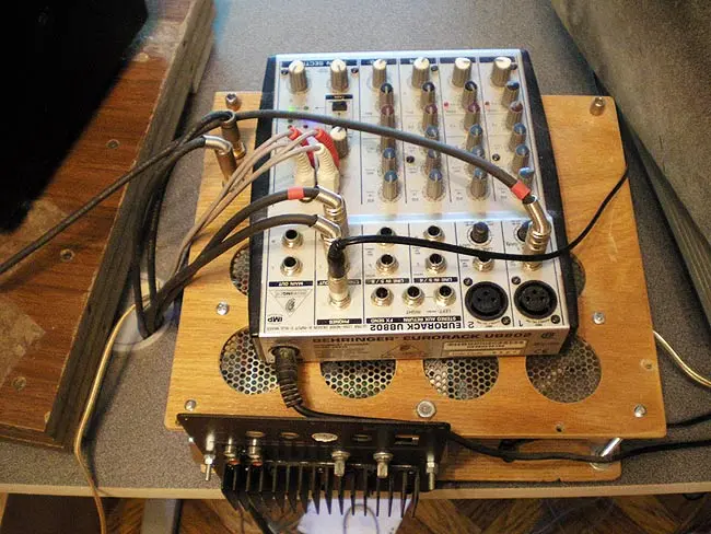 Обнаружив, что ручки тембров у меня всегда стоят в 0, я пустил сигнал с микшера напрямую на оконечник, и фееричная ручка громкости на усилителе осталась не при делах. Под трансформатором проделано пятисантиметровое отверстие, чтобы не было ему жарко, а сам он закреплен через сантиметровой толщины пенополиэтилен и резиновые прокладки. Гудит он немного. А при таком креплении этого не слышно. Вообще.