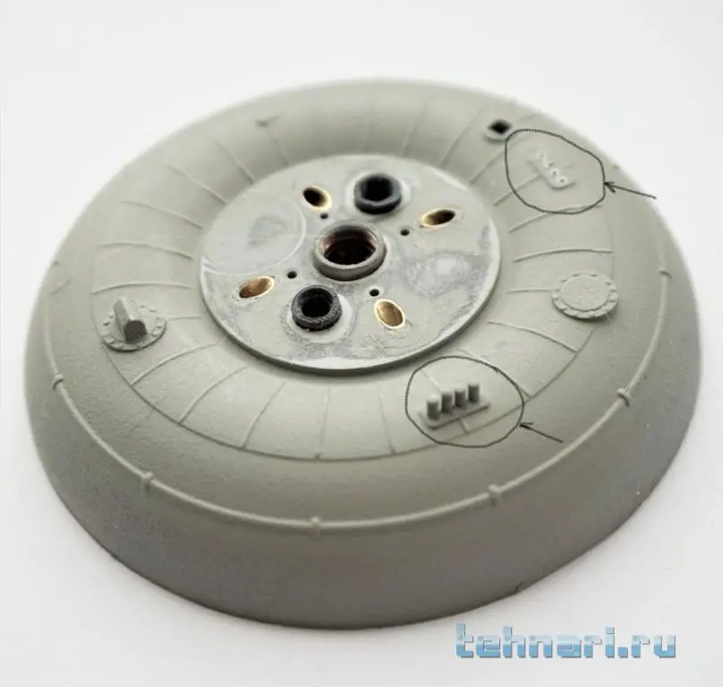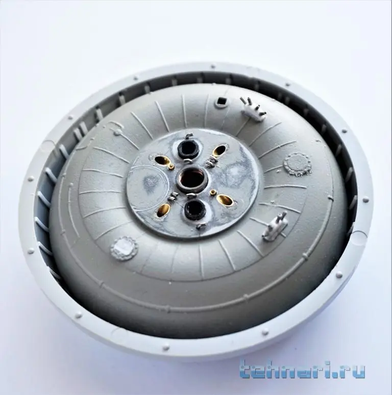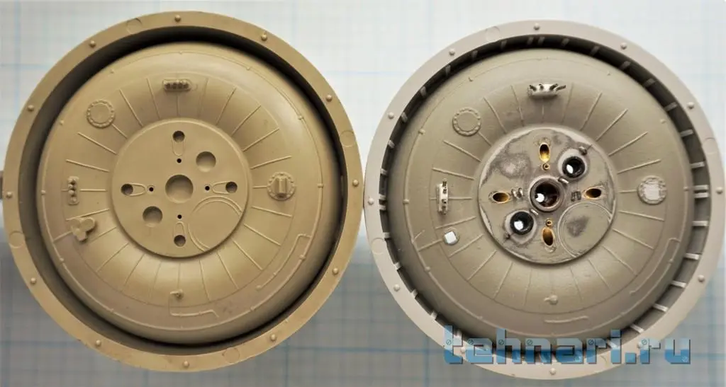 На снимке донной части корабля на внутренней стороне юбки, обрамляющей торовый бак, видны усиливающие накладки. Ничего подобного в данной детали из коробки не просматривается, но это легко устранимо при помощи "лапши", нарезанной из 0,5мм листового пластика и клея. После приклейки усиливающих накладок юбка стала выглядеть вот так. Вставляем в нее торовый бак и получаем обновленную кормовую часть приборно-агрегатного отсека корабля. Крайнее фото для сравнения: было-стало.