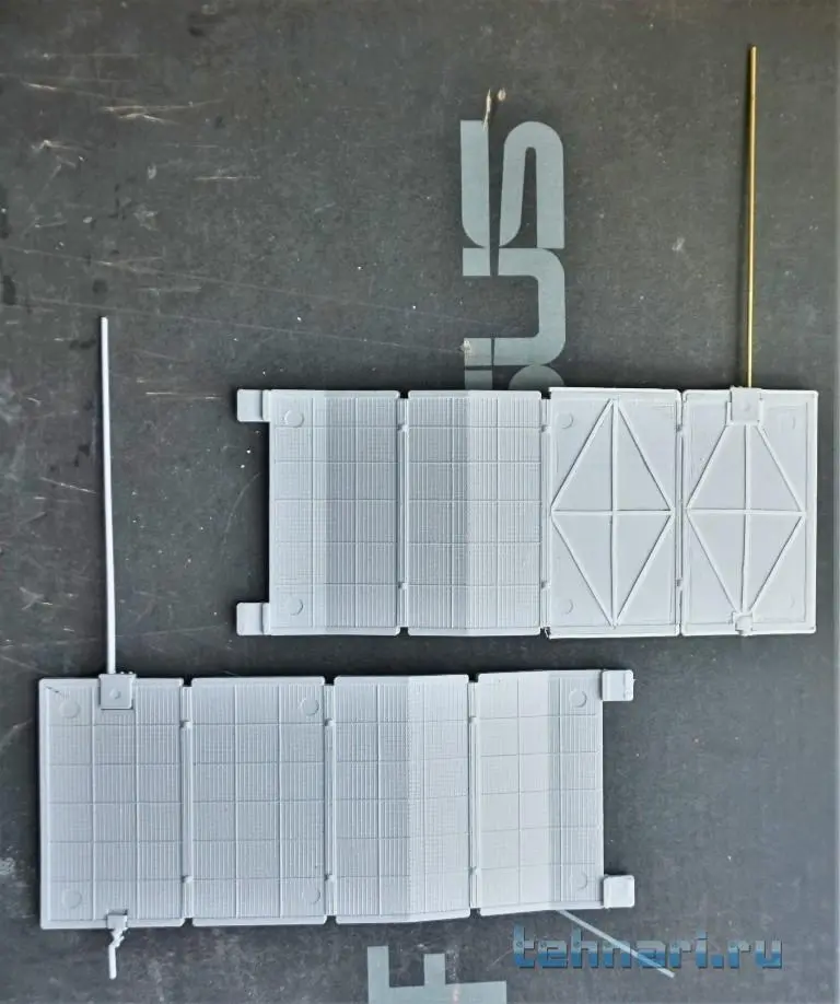 Пока проходит поиск ответа по одному из элементов конструкции на кормовой части приборно-агрегатного отсека, я займусь оформлением панелей солнечных батарей. В модели из коробки панели выполнены в масштабный размер и с соблюдением линий изгиба панелей, как в реальной конструкции, но есть места, которые можно улучшить. Это в первую очередь касается тыльной стороны солнечных панелей, на которой производитель нанес узор из фотоэлементов, как и на рабочей стороне панели. Поэтому аккуратно снимаем этот узор модельным ножом и шкуркой.