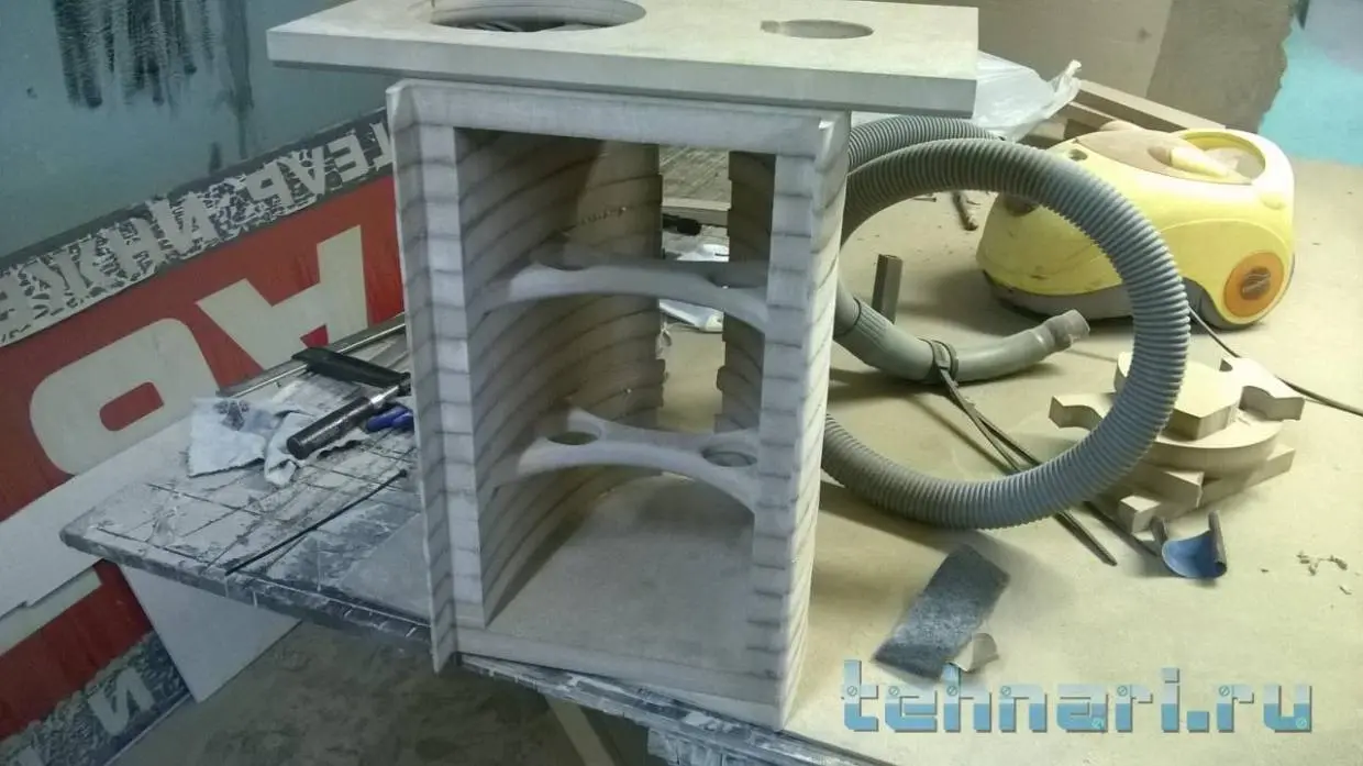 Можно было выпилить её в составе периметра каждого слоя, потом отшлифовать и провертеть дырки под динамики.