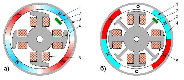 1 — ферритовый постоянный магнит ( а) — 4 полюсный, б) — намагниченный в последовательности NS0NS0; 2 холловская интегральная схема; 3 — магнитопровод (ярмо) якоря; 4 — магнитопровод статора; 5 — обмотка статора.