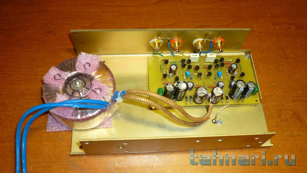 Вот, тестировал на шасси, пред из темы " Простой предварительный усилитель " . Транс имеет вторичку 12 вольт, без среднего вывода. Питание же усилителя -+ 24 в. двуполярное. Из однополярного я делаю двуполярное, дальше стоит удвоитель напряжения, дальше гасящий по земле резистор, дальше стабилизатор напряжения. Всё. Никакой экранировки трансформатора нет. Находится он практически вплотную к плате преда. Первое включение с короткозамкнутыми входами на землю. Именно на предмет шума - фона. К/У усилителя = 5. Включил, и подумал, что не включил. Тишина космическая. Второе включение уже с открытыми входами. Те же яйца. И только когда палец стал подносить ко входу, в АС появился угрожающий рык! Снабер и шунтирующий кондёр на первичку, поставить не успел. Проверял без них. У преда чувствительность низкая, и при правильной разводки земли, никаких посторонних шумов и фона, быть вообще не должно. В фонокорректоре - здесь несколько иначе. В нём чувствительность огромная, и меры по экранировке обязательны. Но лучше вынести трансформатор отдельно. Я обычно так и делаю.