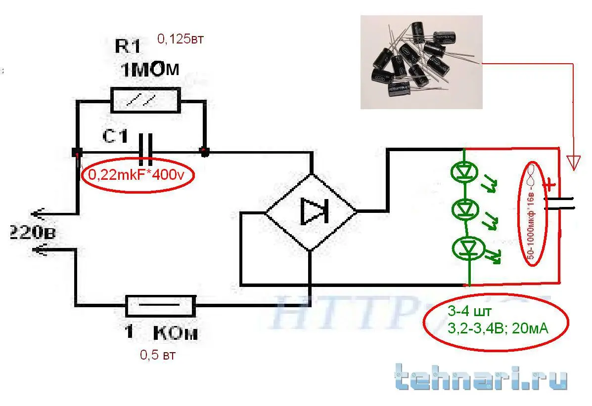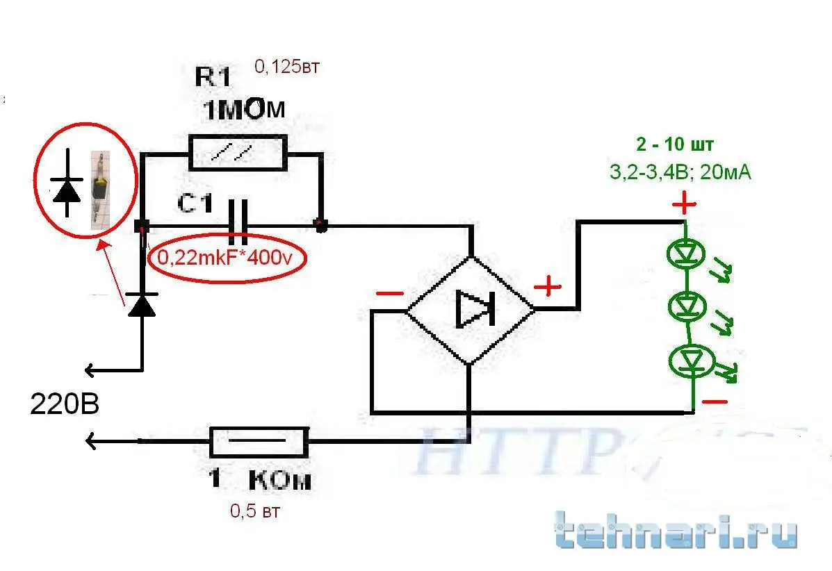 Такая схема пойдет? Я уже прикупил себе 5 шт конденсаторов 0,22мкФ*400в. С ними, и такой схемкой приведенной ниже, сколько светиков получится поставить? А то с определением неизвестных диодов, которых у меня на собиралось, у меня туго и проблематично будет подобрать нужный (я в этом "чайник").