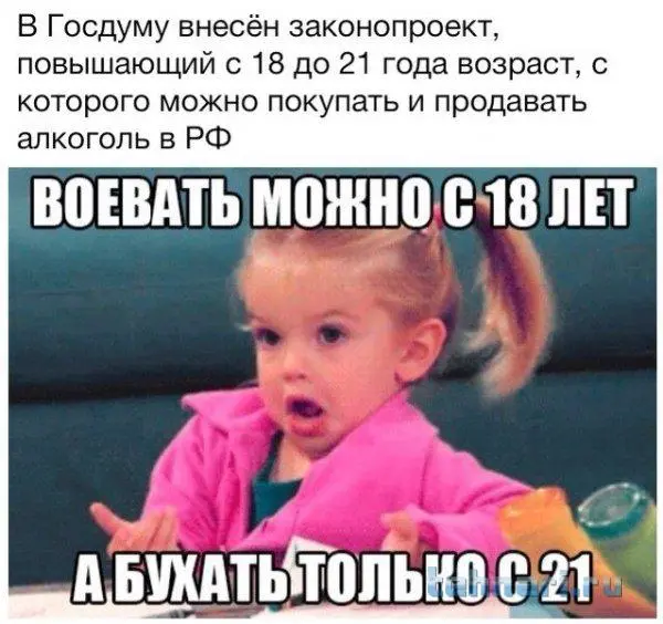 Сегодня протер глаза с утра и первая новость, планируется ограничить продажу алкоголя 21 годом... Текст можете сами нагуглить, не хочу эти многабукф здесь выкладывать, их все равно никто не читает. Я вот логики не понимаю, тоесть человек может в армию идти, даже жениться, но бухать ему ни ни? Тупо передирают у американцев, у них там полно тупых законов, вроде запрета лизать лягушек но этот по-моему самый тупой так дойдет скоро и его начнут лоббировать. Свадьба получается без алкоголя, если чел жениться в 18, то ему придется сидеть насухо, равно как и всем его друзьям, которые в основном погодки. Более того он даже не сможет купить алкоголь для более старших гостей, так как ему не продадут. На войне в горячей точке тоже, на вот тебе автомат, иди защищай, но накатить перед боем 100грамм тоже нельзя, так как кто то инициативный с активной гражданской позицией пролоббировал такой вот закон. И что еще интересно аргументируют, типа человек в 18 не способен адекватно оценить вред от бухла для своего орагнизма, тоесть идти на выборы он способен адекватно проголосовать, а вот посчет цедваашпятьоаш нет! Что думаете, по мне так 18 оптимальный возраст для продаже алкоголя, хотя можно даже уже в 16 разрешить покупать, но не пить.