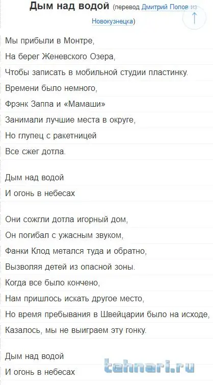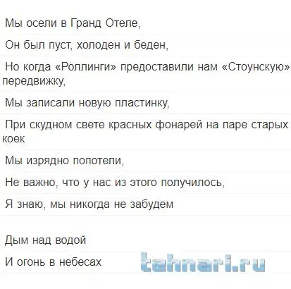 Да расслабься ты! Всё нормально! Пусть будет дым около воды, или дым за водой. Тебе как больше нравится? А мне больше сама композиция нравится. У тебя чего там, с юмором проблемы? Какие то там переводы литературные приплёл! Какие на фиг переводы? Шутю я ! Я вообще пошутить люблю. Не уж то не заметил? А вот людям без чувства юмора, я бы инвалидность давал.....