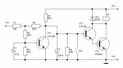 А какая кнопка вкыл\ выкыл у этого усилителя? Если в ней есть два средних незадействованных контакта ( такие кнопки стояли почти на всех совковых усилках ) то можно сделать вот такую схемочку. Будет и задержка подключения динамиков, и их защита от постоянки, и мгновенное отключение . Два незадействованных контакта подключаем как показано на схеме. Sa 1.