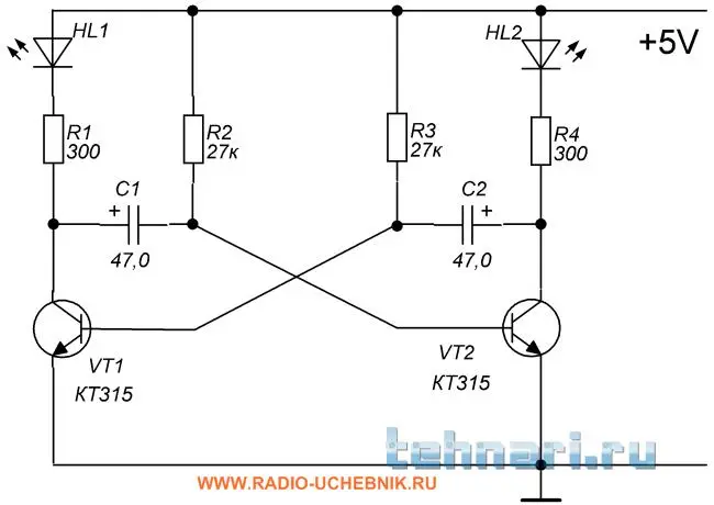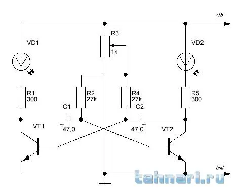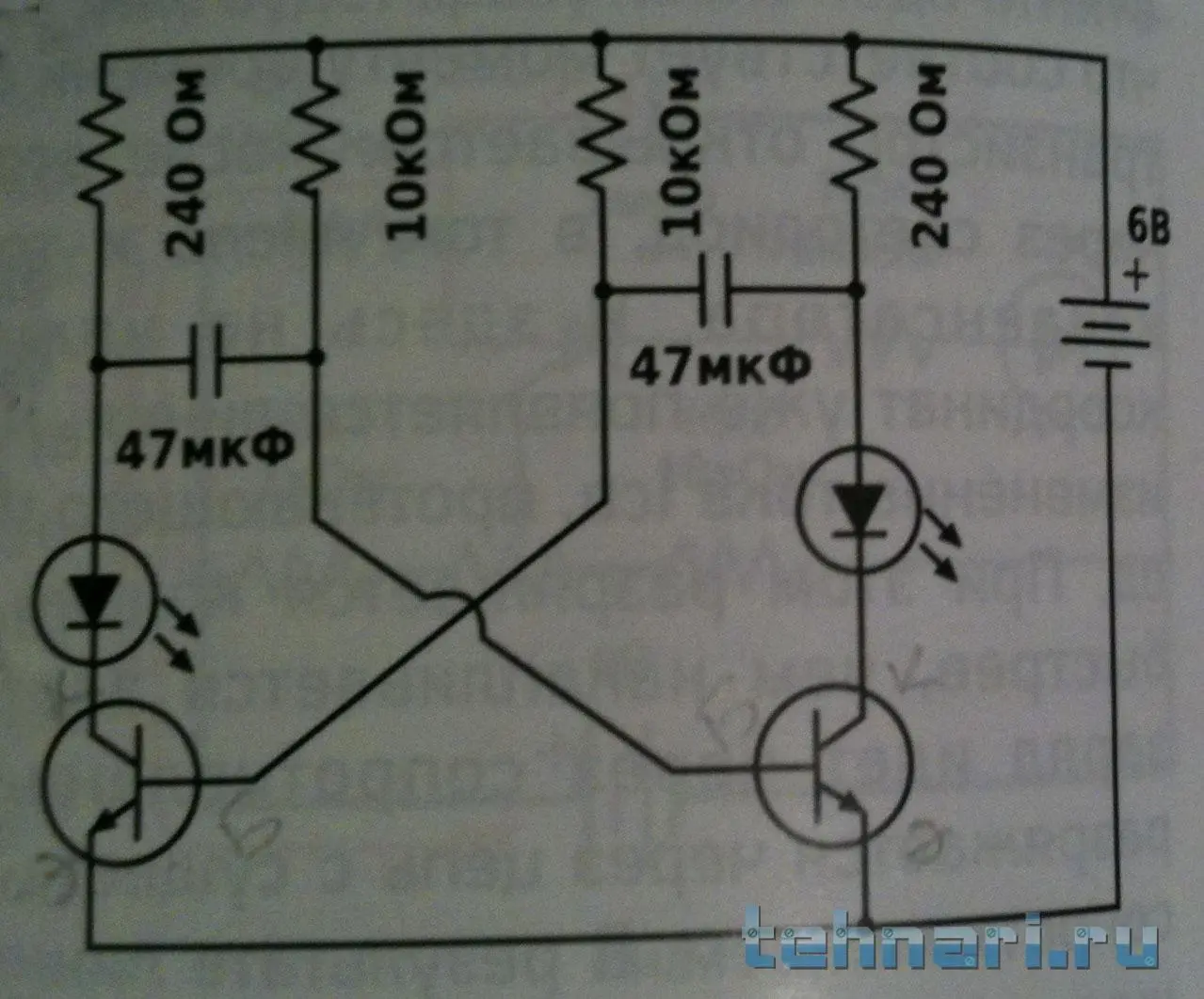 Здравствуйте. Собрали сегодня с ребёнком на монтажной плате мультивибратор по вот такой схеме. Подключаем питание, светодиоды вместо того чтобы мигать, просто светятся. Качнула один светодиод пару раз вправо влево, оба светодиода замигали. Отключаем питание, подключаем - та же история - светятся, но не мигают, подвигала светодиод - замигали. Почему так происходит?