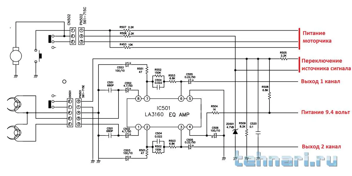 Прикладываю кусок схемы от магнитолы. Здесь видим, что сигнал с магнитных головок сначала поступает на микросхему LA3160. Как я понял, это предусилитель? Я подключал усилитель непосредственно к головкам, и звука не было, только небольшой гул, меняющий свой тон при включении перемотки (т.е. гул от мотора).