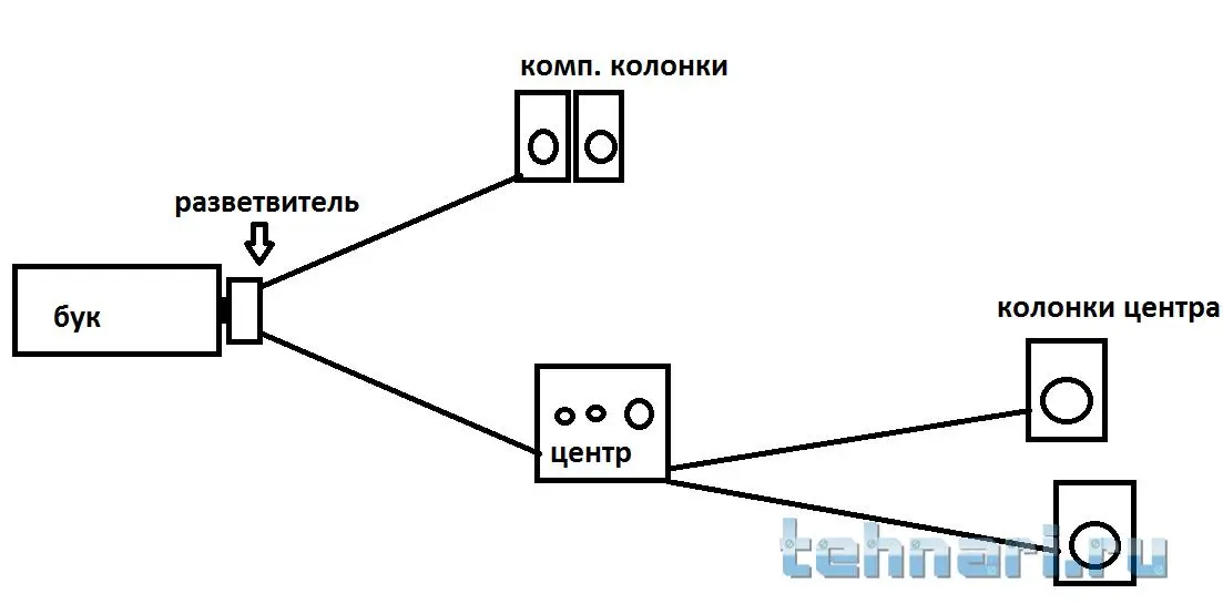 Разветвитель есть. Как подключить дополнительные колонки к ноуту в принципе понятно. А вот как запараллелить это все с муз. центром?