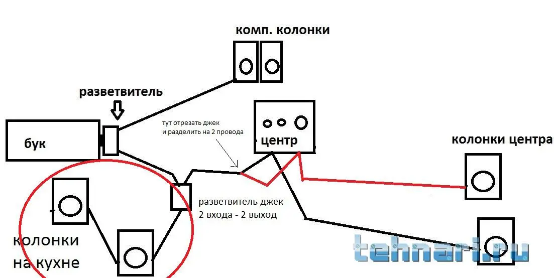 Предполагается, что в колонках, выделенных красным кружком, должна играть музыка либо с бука, либо с центра. Соответственно в колонках бука - только музыка с бука, в колонках центра - только музыка с центра.