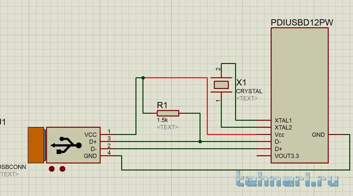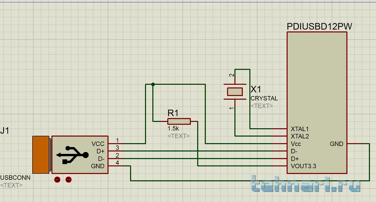 Вначале, я подключал схему без R1 (подтягиванием одной из линий данных к V_BUS через резистор 1,5 кОм D− для режима Low-Speed и D+ для режимов Full-Speed и High-Speed).