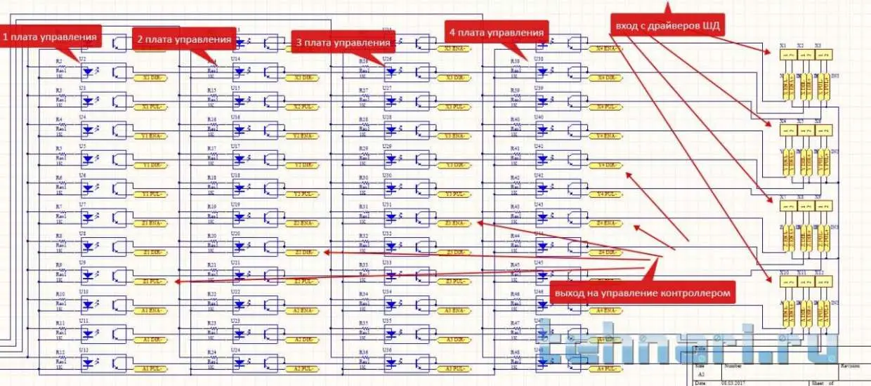 3. Каждый рабочий MCU имеет выходные управляющие линии, нагруженные на оптроны через резисторы. Ответные части оптронов ( транзисторы ), включены параллельно одноименным сигналам управления на драйверах ШД.