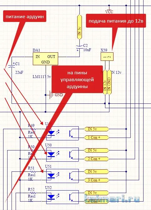 грубо говоря, оптрончики мне нужны чтобы тупо перекидывать плюс на нужную дуню, можно конечно и без этого сделать, прямо с управляющей ноги центральной дуни (с которой будет производится все преключение) залепенить на +5 нужных дуней, но чот мне кажется это не айс... да и питания может не хватить... у дуньки вроде совсем мало ампер на ногах, а тут через оптрон напрямую с БП можно зарулить