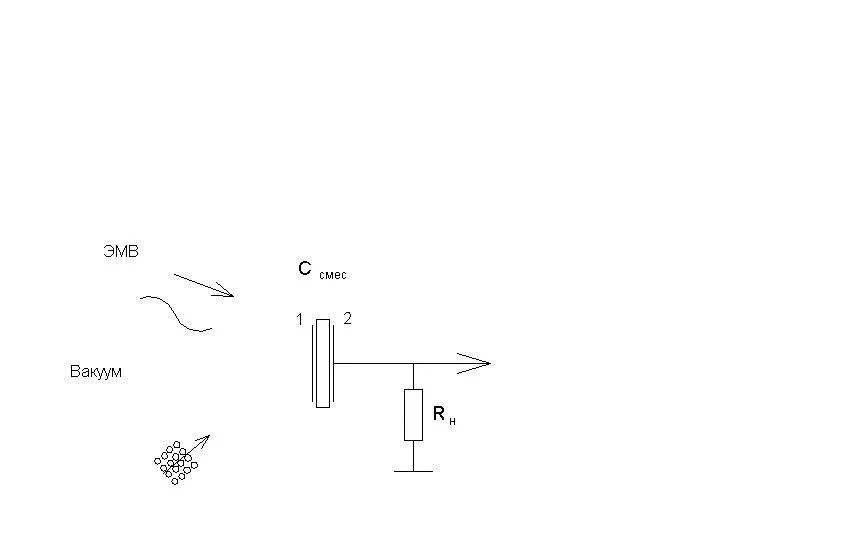 Итак, ЭМВ падая на первую обкладку С-смесительного конденсатора, генерирует на нём как на антенне переменные эл.заряды (или напряжения) высокой частоты с резонансной частотой на которую она(они) настроена. Далее происходит импульсная генерация электронов, которые также падают на первую обкладку и создают на ней импульс напряжения (или заряда).