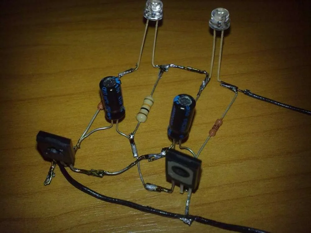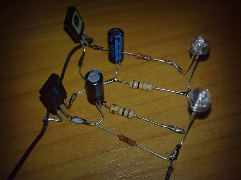 НЕ правильно спаял схему. Смотри, к плюсу питания подключены два резистора и два анода СД. А у тебя как?