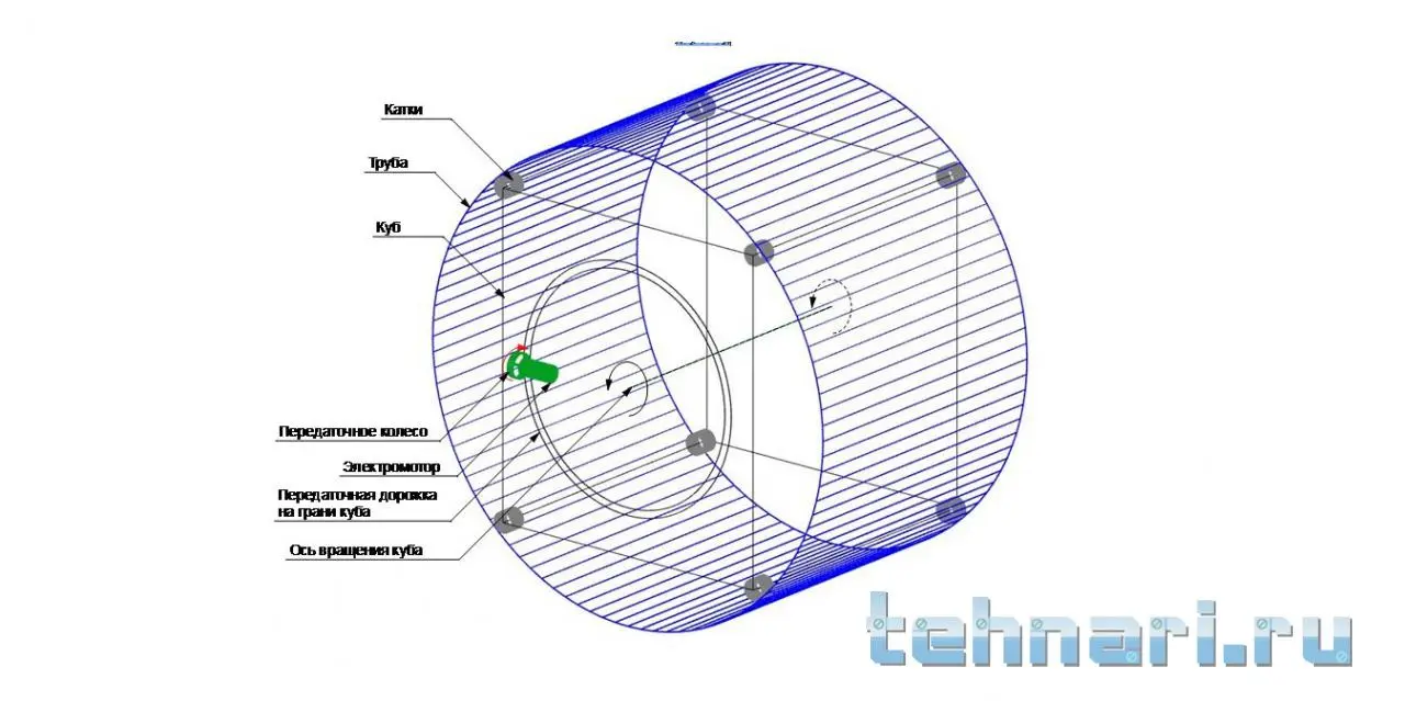 Подскажите простой механизм для проворота куба со стороной 2, 9 м и весом 1 т. по направляющим внутри трубы диаметром 3м и длиной 3 м. Так что бы его было легко сделать или купить готовый и привод был как электрический, так и ручной.