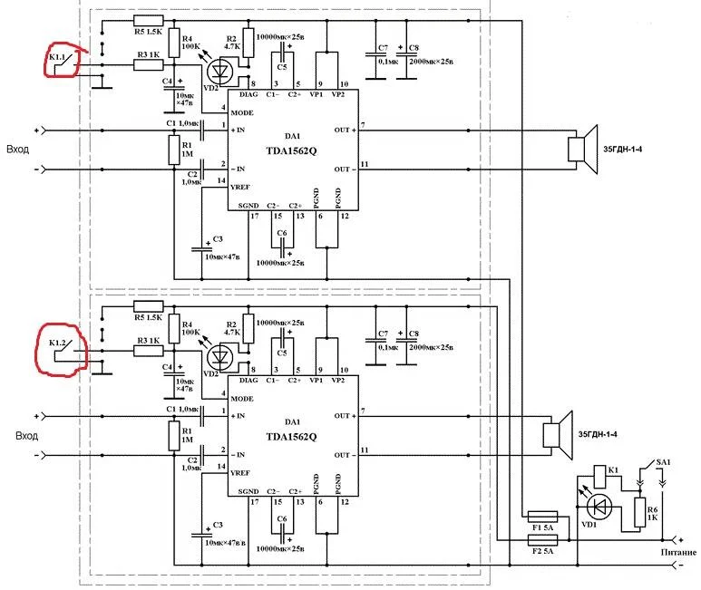 При подключении усилителя у меня возникли некоторые вопросы! при включении усилителя переключатели К1.1 и К1.2 должны замыкаться или размыкаться??? и какую функцию выполняют светодиоды VD2?? к сожалению не могу снова выложить схему так так проблемы с интернетом, если кто то сможет помоч, схема есть на предыдущих страницах, на двух TDA 1562q спасибо.