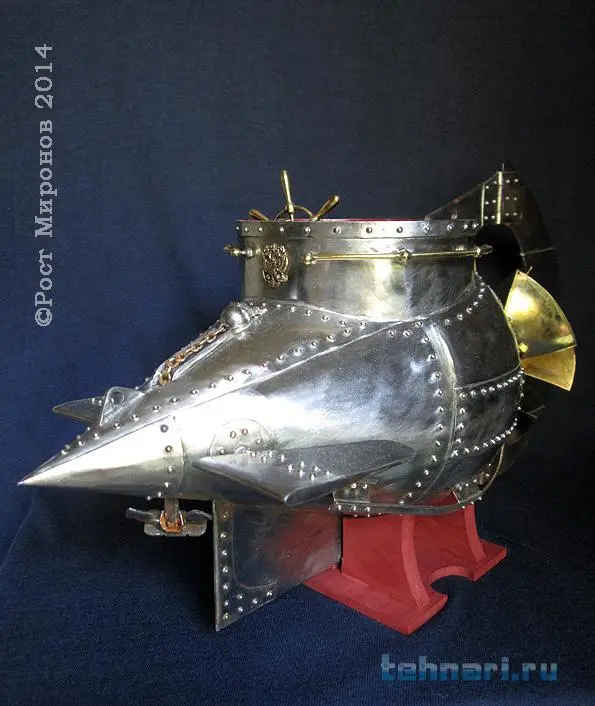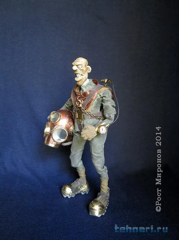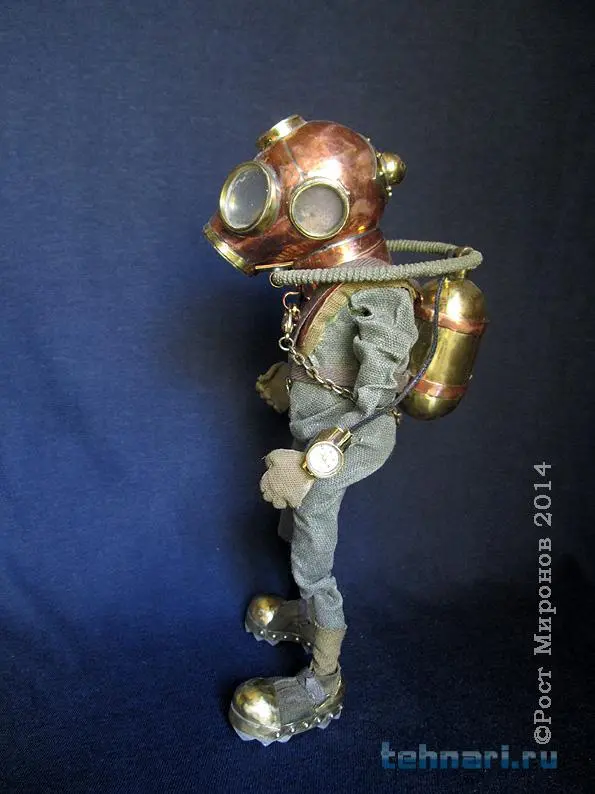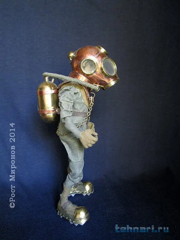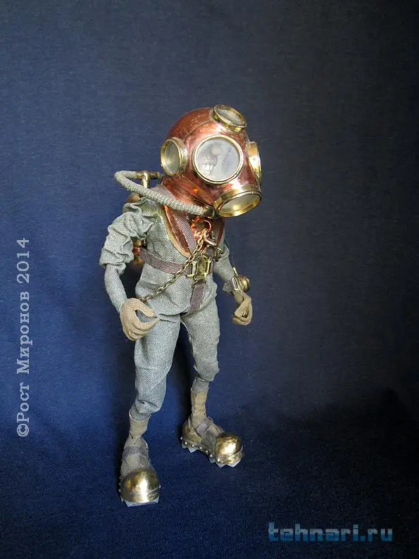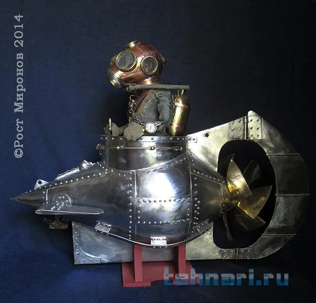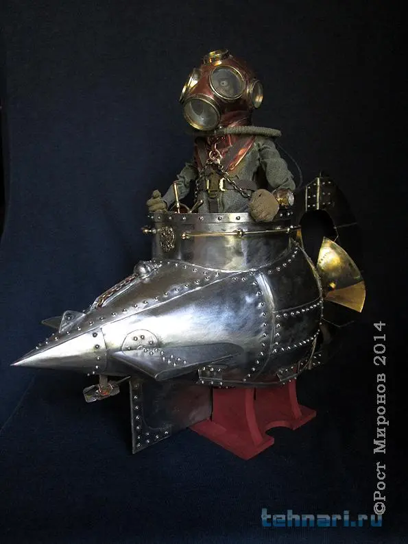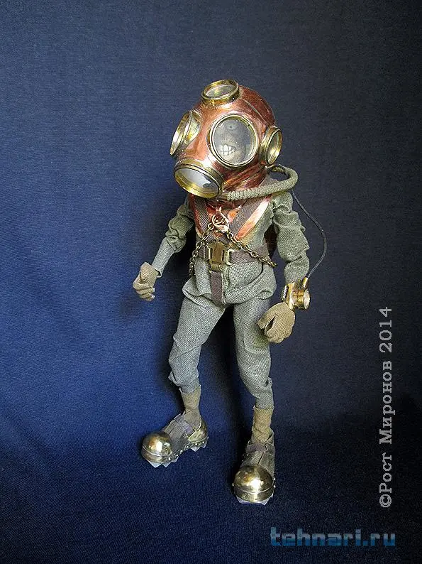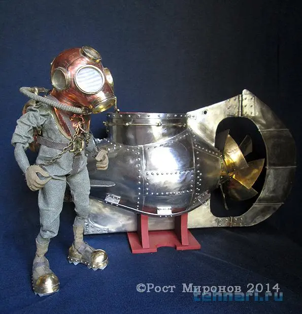 Оснащён: подводным дыхательным аппаратом мастера из Владивостока Рапанова с гоночным шлемом особой выделки.